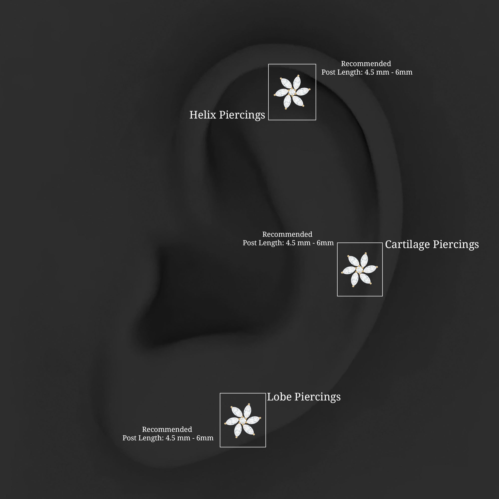 This sparkling Diamond Flower Earring is a botanical masterpiece, showcasing an exquisite design and craftsmanship. Adorned with shimmering marquise shape diamonds that are encrusted as petals with a dainty round diamond in the center, this earring exudes timeless charm. You can wear this diamond floral earring on the Helix, Cartilage, and Upper Lobe, it adds a touch of natures beauty to your unique style. This diamond cartilage earring is ideal for any occasion, it elevates your look. You can style this stunning earpiece with casual or formal outfits. With its timeless appeal and meaningful symbolism, this Floral Stud Earring is a stunning and elegant addition to any jewelry collection. The brilliant sparkle of the certified Diamonds is sure to catch the light and draw attention to the wearer. This Flat Back Earring would make a thoughtful and beautiful gift for someone special or a lovely treat for yourself.