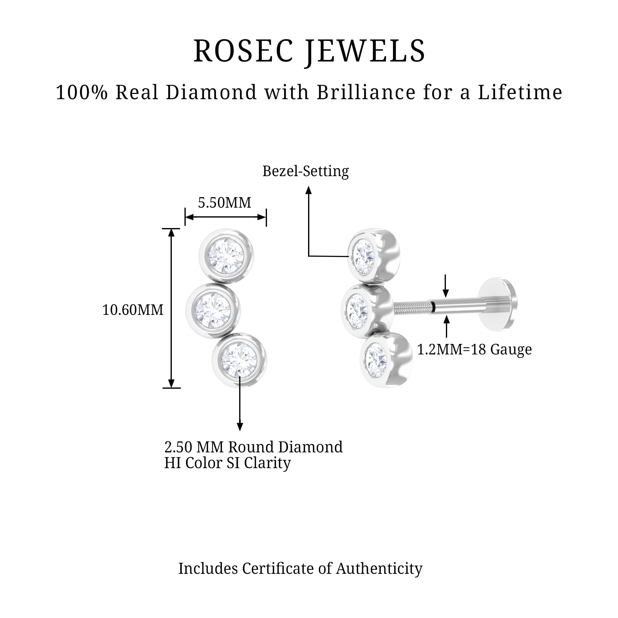 Enhance your ear-piercing jewelry collection with this timeless Diamond Curved Earring. Adorned with three certified round cut diamonds, each stone is beautifully secured in a sophisticated bezel setting. You can wear this Three Diamond Earring on its own or layer it with your other cherished jewelry pieces. It can be styled on your Helix, Cartilage, or Upper Lobe Piercing. Ideal for daily wear, this diamond Three Stone Earring demonstrates that a little sparkle can make a significant impact. This Curved Helix Earring makes a wonderful gift for any special occasion, such as a birthday, anniversary, graduation, or for bridesmaids. Representing timeless elegance, this Bezel Diamond Earring adds a luxurious touch to your outfit and features a secure flat back closure. With its classic charm and understated luxury, this earring embodies a flair for celebrating an exotic style statement. Combining exquisite craftsmanship with a hint of glamor, it serves as a striking accessory. With its modern yet elegant appearance, it carries a traditional style that reflects the continuum of time, symbolizing your past, present, and future.