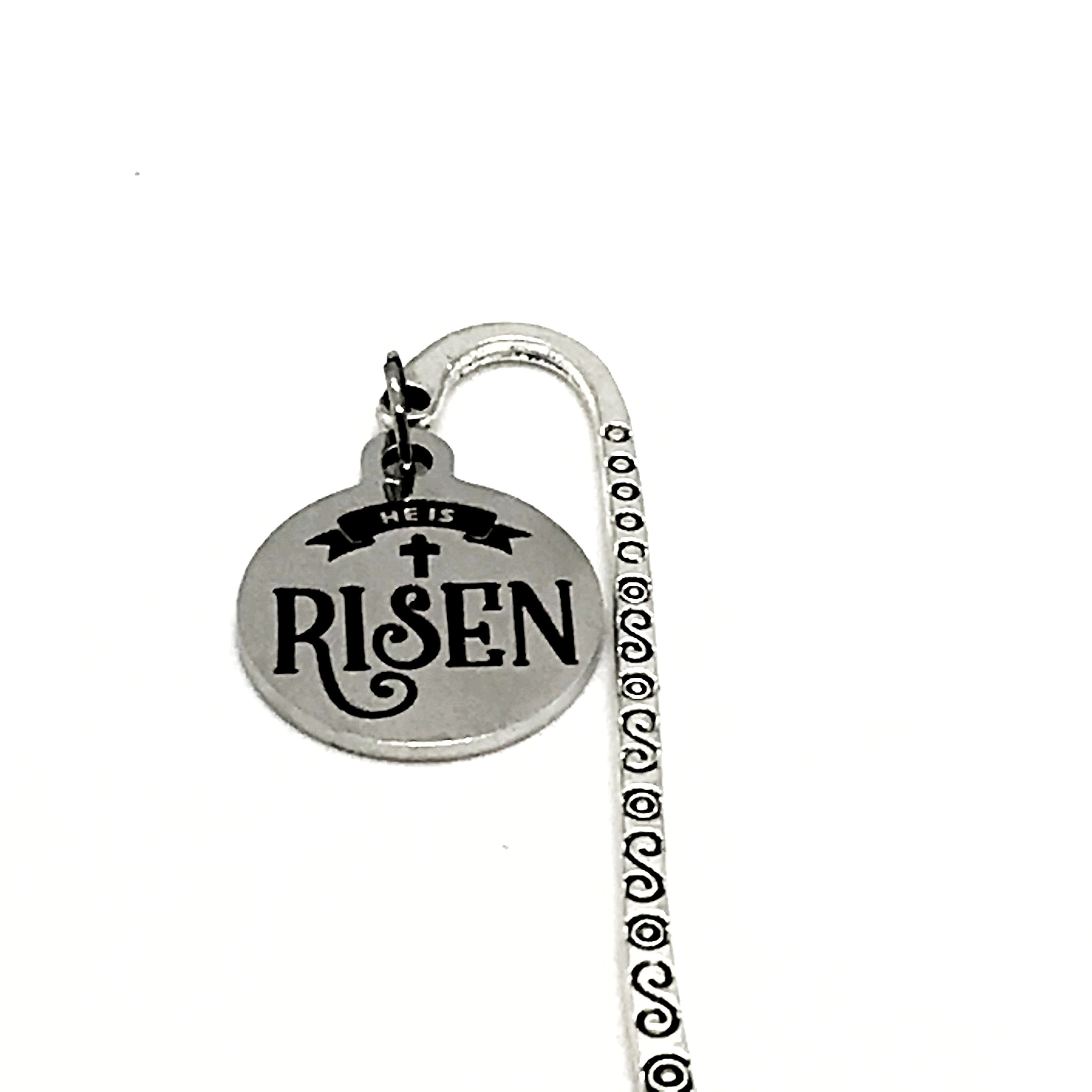 This is a great reader gift for a Christian. It is a metal bookmark with a charm that says, "He is Risen" The bookmark measures approx. 3.3 inches in length and the charm is approx. 3/4 inch across