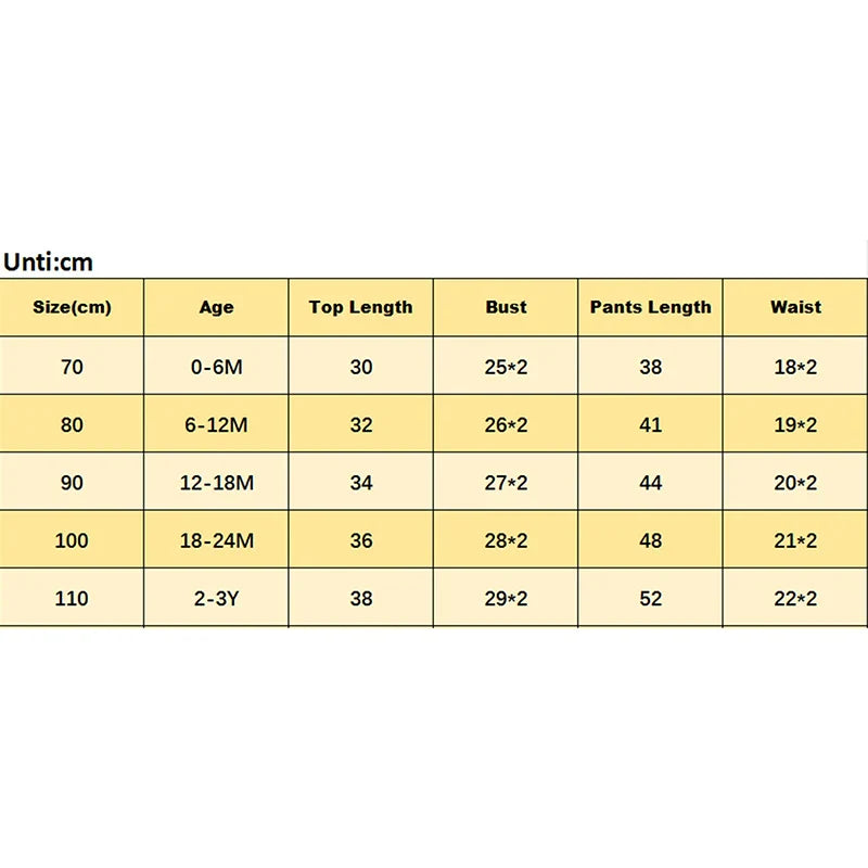 12-18M Tops Length: 13.39 Bust: 21.26 Pants Length: 17.32 Waist: 15.75 Advised Age: 12-18 Months