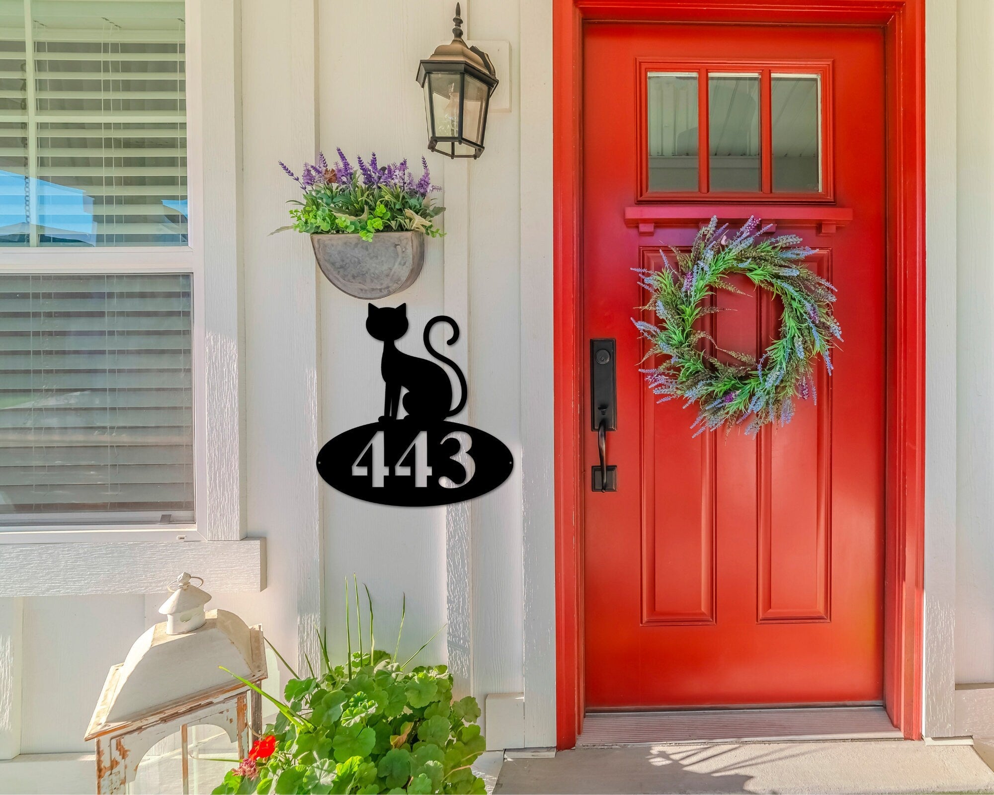 Halloween House Number Sign, Custom Halloween Address Sign, Black Cat Address Sign, Outdoor House Number ‐ Red / 6inch