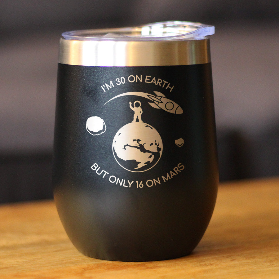 Age on Mars 30 - Wine Tumbler Cup with Sliding Lid - Stainless Steel Insulated Mug - Unique Funny 30th Birthday Gifts for Women and Men