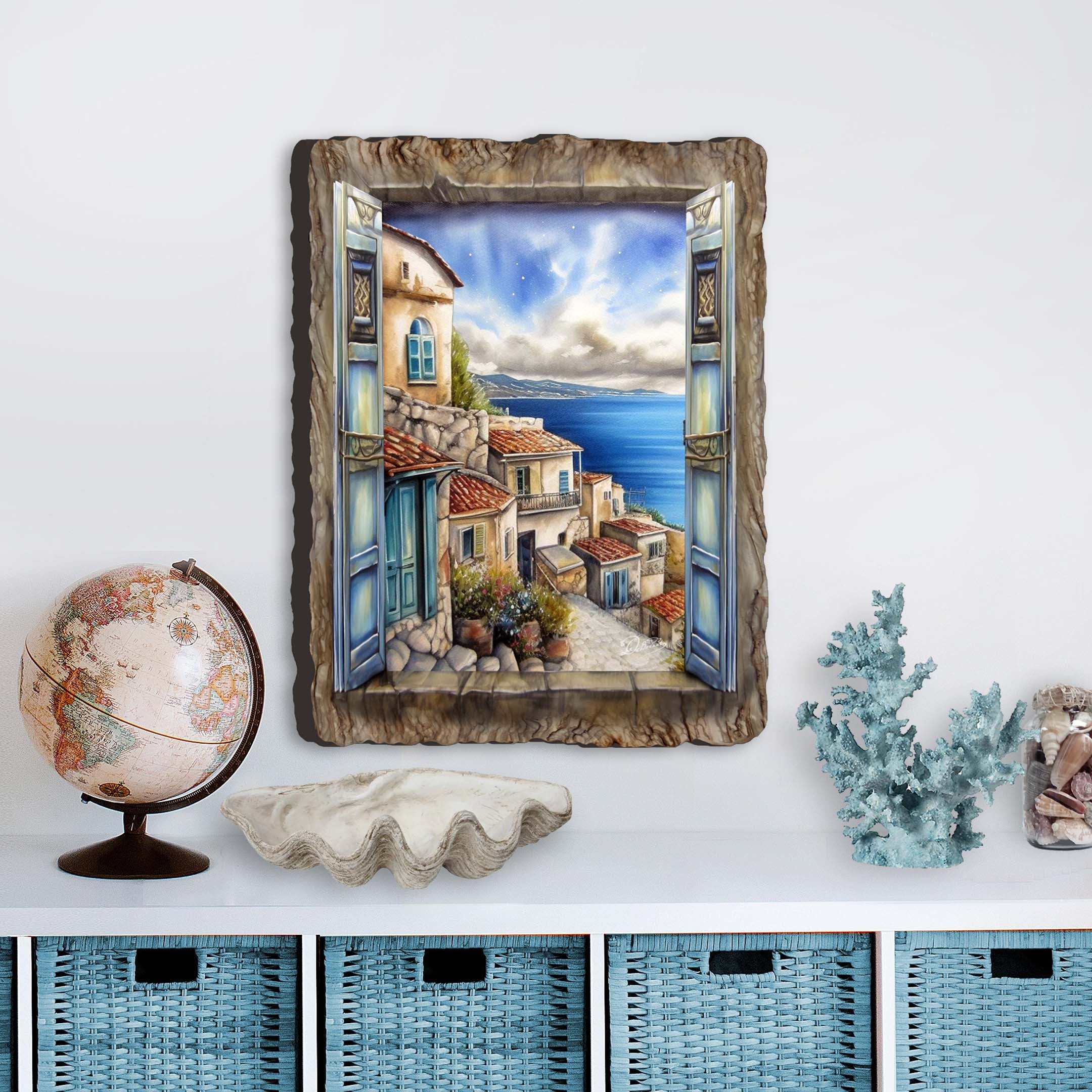 Experience the beauty of a seaside escape with the Coastal Town Window Wall Art by G. DeBrekht. Featuring a charming old town and serene ocean view, this piece adds a touch of coastal elegance to your décor. Bring a piece of the coast home with this stunning wall art.
