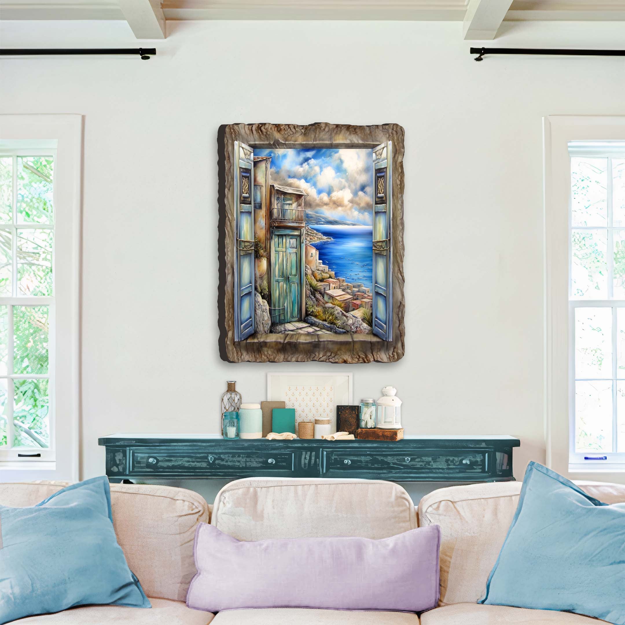 Experience the serene beauty of the coast with Coastal View Landscape Window Wall Art by G. DeBrekht. Featuring a charming old town and a captivating window view, this piece adds a touch of coastal Decor to any space. Transform your walls into a calming seaside escape with this stunning artwork.