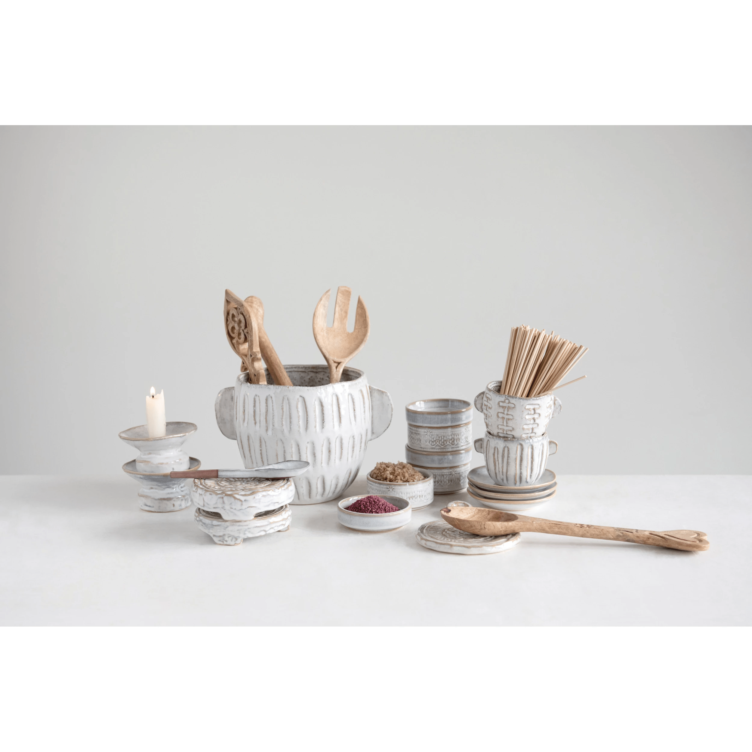 With ear-style handles, this off-white stoneware planter features a remarkable reactive glaze finish. The glazing process creates individual works of art on each distinctive piece. Fill it with a potted plant and display on a tabletop or mantel for an amazing accent to your home decor.