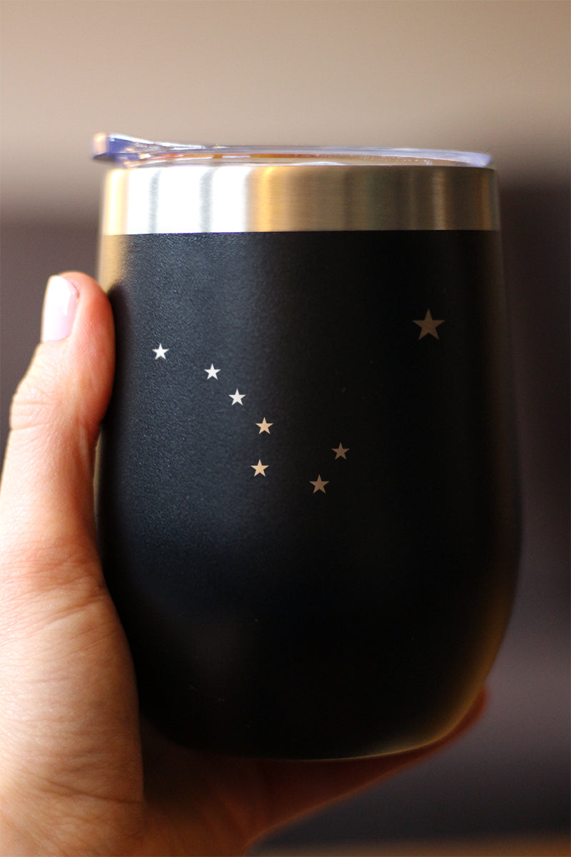 Flag of Alaska - Wine Tumbler Glass with Sliding Lid - Stainless Steel Insulated Mug - Alaskan Themed Gift for Men and Women Alaskans ‐ Black