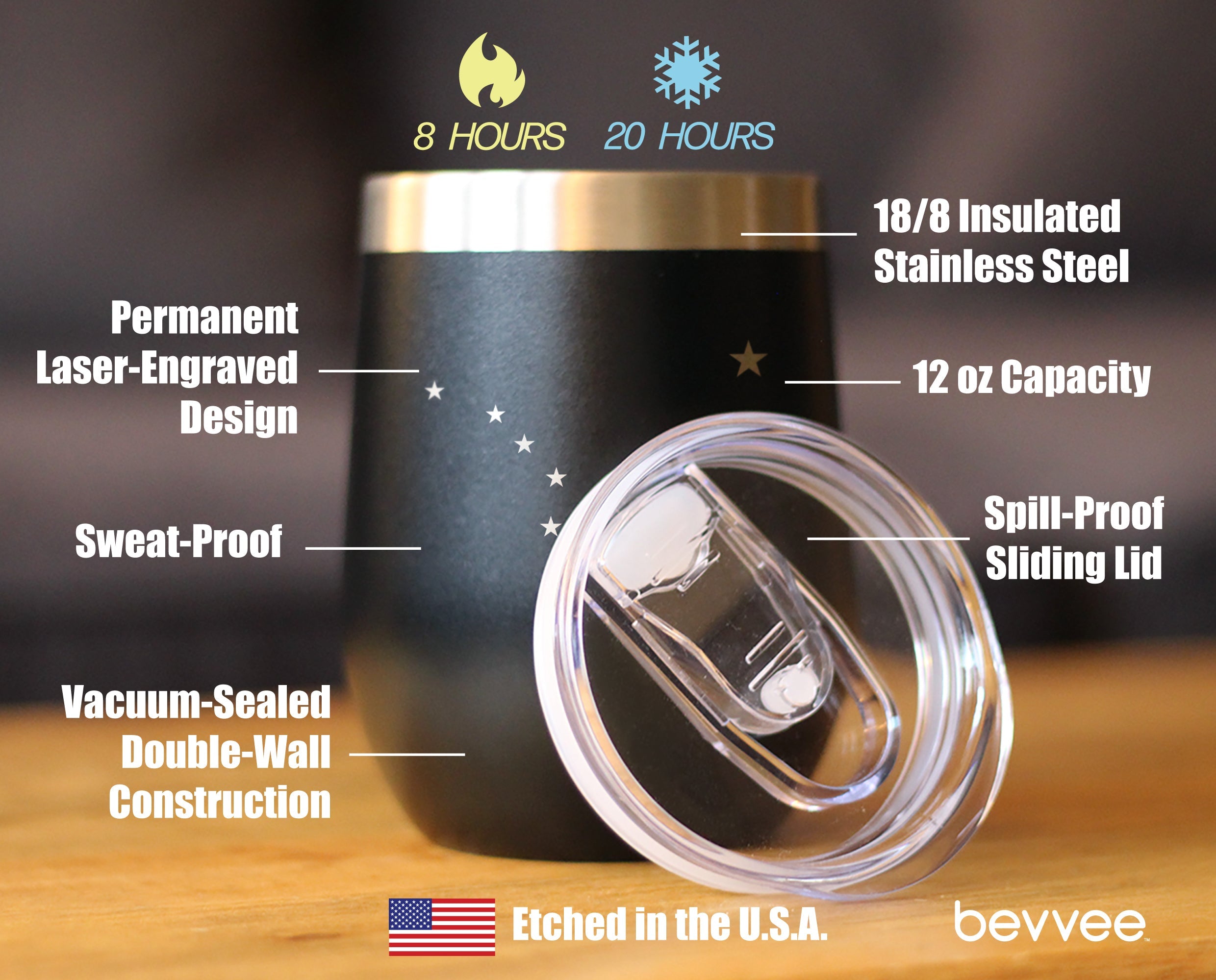 Our 12oz. stemless wine tumblers with sliding lids feature stainless steel double-wall construction, vacuum insulated for 2X cold and heat retention compared to glass or plastic containers! Etched in America.