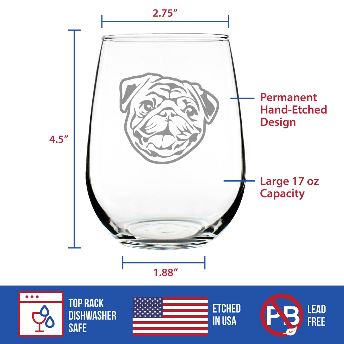 Happy Pug Stemless Wine Glass - Cute Dog Themed Decor and Gifts for Moms & Dads of Pugs - Large 17 Oz Glasses