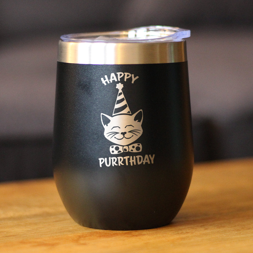 Happy Purrthday - Wine Tumbler Glass with Sliding Lid - Stainless Steel Insulated Mug - Unique Cat Birthday Gifts for Women and Men