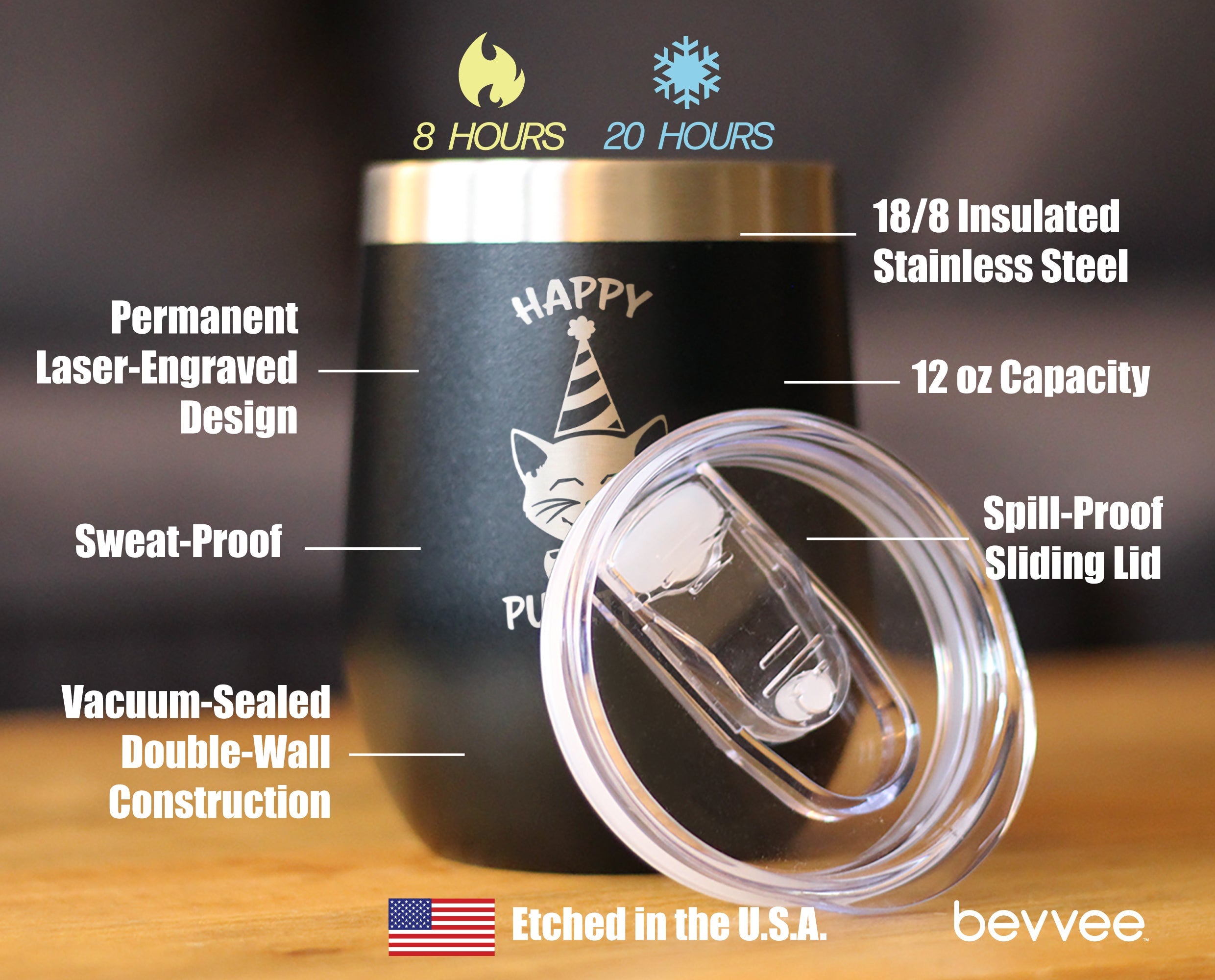 Our 12oz. stemless wine tumblers with sliding lids feature stainless steel double-wall construction, vacuum insulated for 2X cold and heat retention compared to glass or plastic containers! Etched in America.
