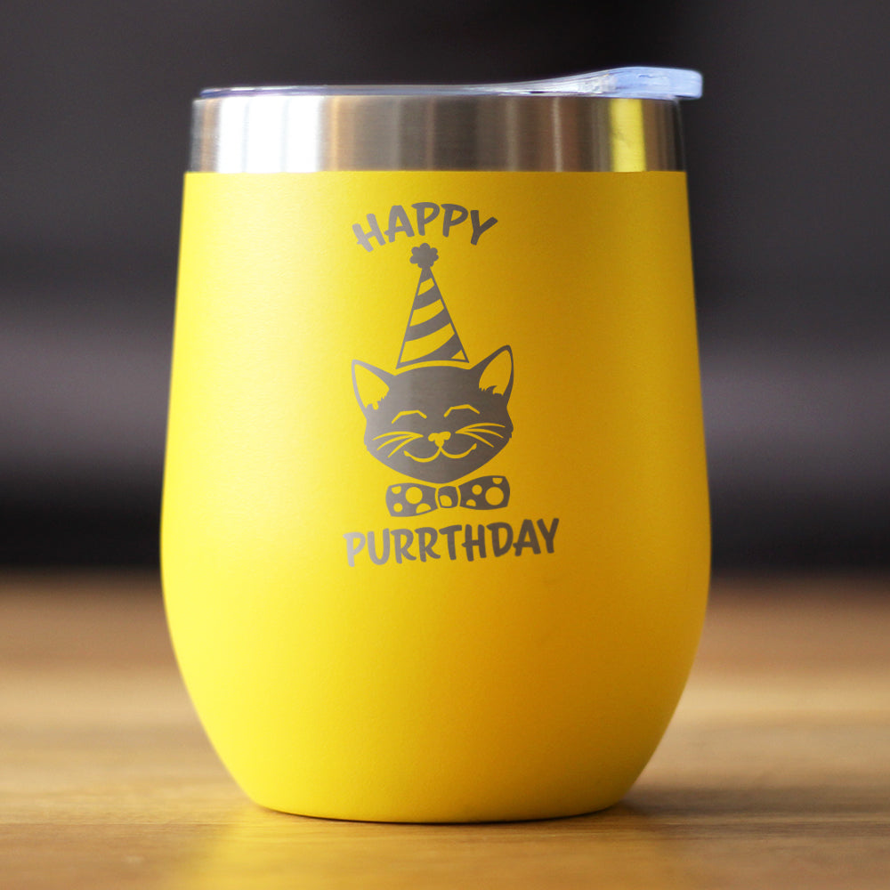 Happy Purrthday - Wine Tumbler Glass with Sliding Lid - Stainless Steel Insulated Mug - Unique Cat Birthday Gifts for Women and Men ‐ Yellow