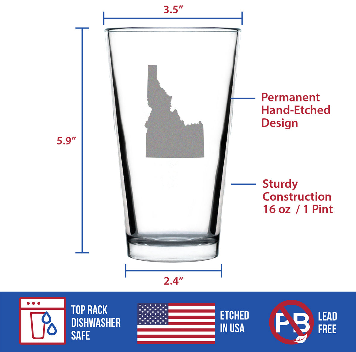 Idaho State Outline Pint Glass for Beer - State Themed Drinking Decor and Gifts for Idahoan Women & Men - 16 Oz Glasses