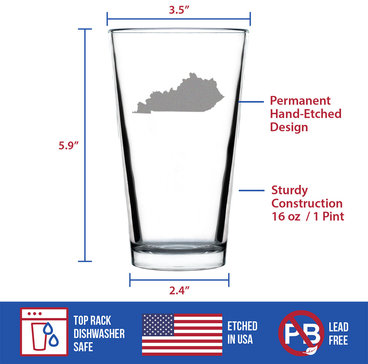 Kentucky State Outline Pint Glass for Beer - State Themed Drinking Decor and Gifts for Kentuckian Women & Men - 16 Oz Glasses
