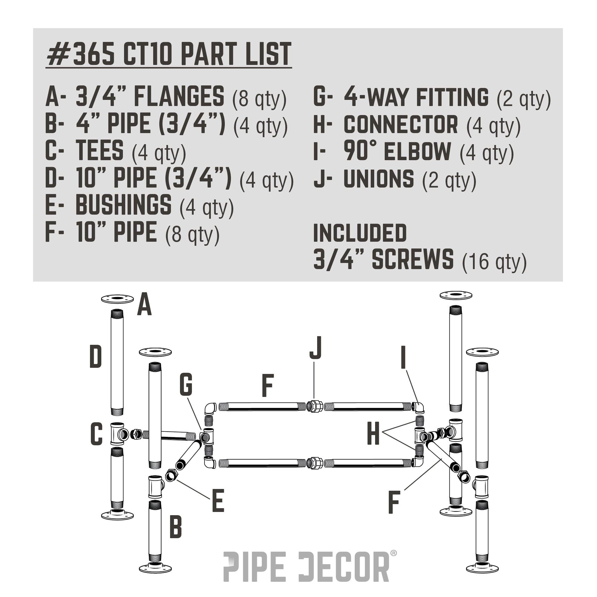Our Loop coffee table is for those who like a little gracefulness with their pipe. With this table, we have given you the sheer brawn of industrial design but added an unexpected touch of interest with an elongated loop at the base. Your living space will reflect your penchant for vintage steel design while giving a glimpse of your gentler nature. Steel pipe, when paired with wood, fits in nicely with French and Industrial Farmhouse, Mid-Century Modern, DIY, Vintage and Rustic design. This kit uses a combination of 3/4 in. and 1/2 in. pipe and fittings. Screws and a set of illustrated step-by-step instructions are also included. The wood tabletop is not included. Choose your own top to create a look that is uniquely yours. Glass tops are not recommended as they cannot be attached to the base.