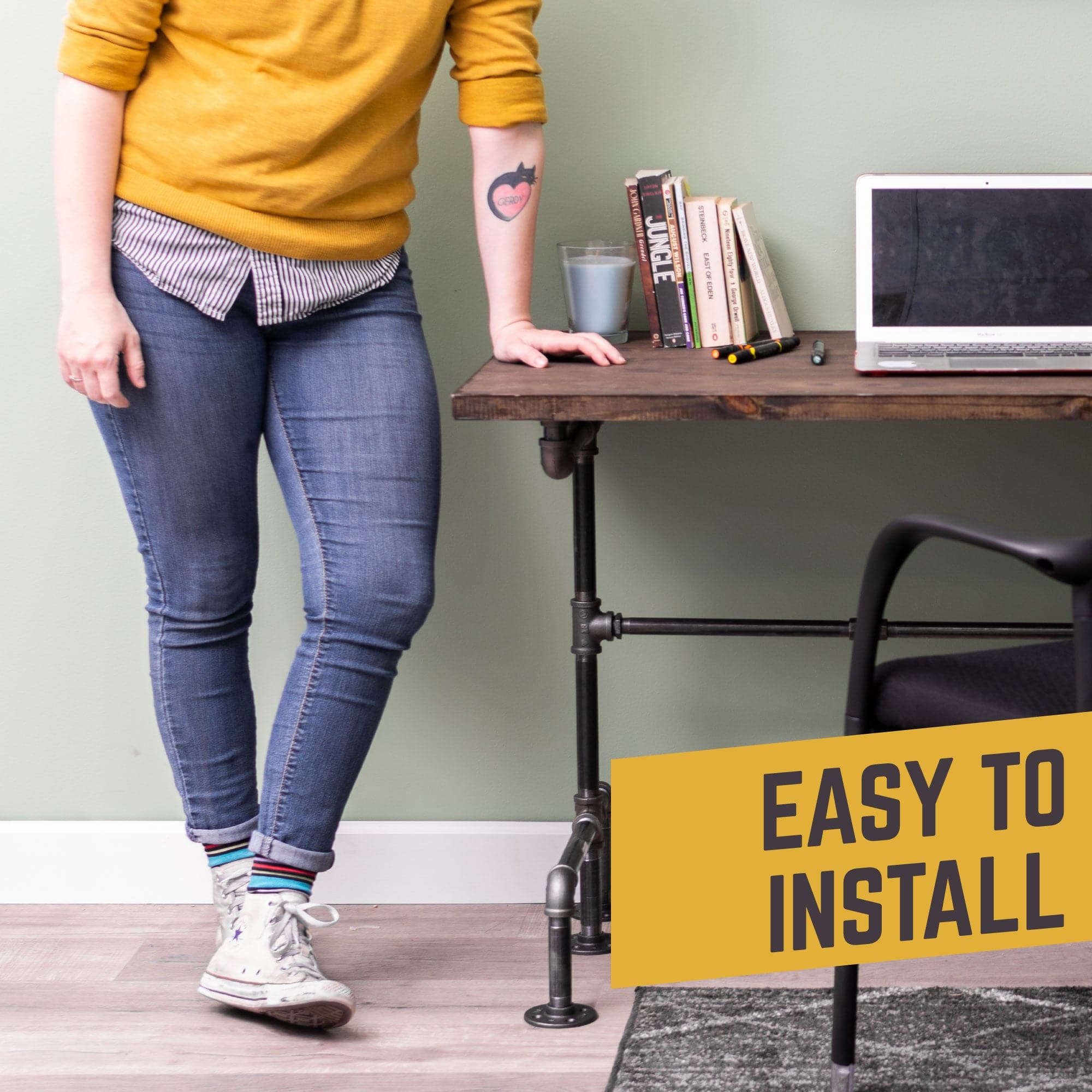 The "M" desk is for those who mean business. This true industrial style desk, from Pipe Decor, sits on six substantial flanges plus utilizes multiple fittings and authentic black steel pipe. Our M desk exudes that air of confidence that comes from hard work and a job well done. Who knows, the industrial revolution just might have started with a desk like this. Steel pipe, when paired with wood, fits in nicely with French and Industrial Farmhouse, Mid-Century Modern, DIY, and Vintage design. This kit uses a combination of 3/4 in. and 1/2 in. pipe and comes with all necessary fittings and flanges needed for assembly. Screws and a set of illustrated step-by-step instructions are also included for your convenience. The wood desktop is not included. Choose your own desktop to create a look that is uniquely yours. Glass tops are not recommended as they cannot be attached to the base.