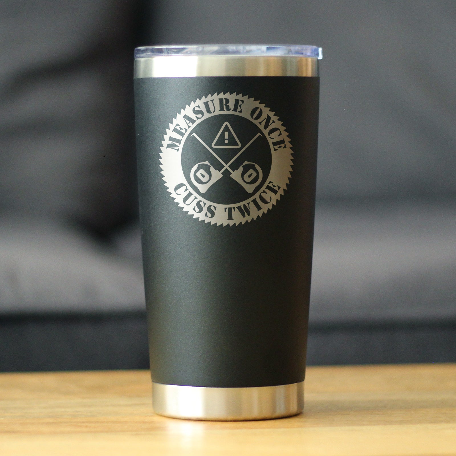 Measure Once Cuss Twice - Insulated Coffee Tumbler Cup with Sliding Lid - Stainless Steel Insulated Mug - Best Gifts for Woodworkers, Construction Workers & Handy Man