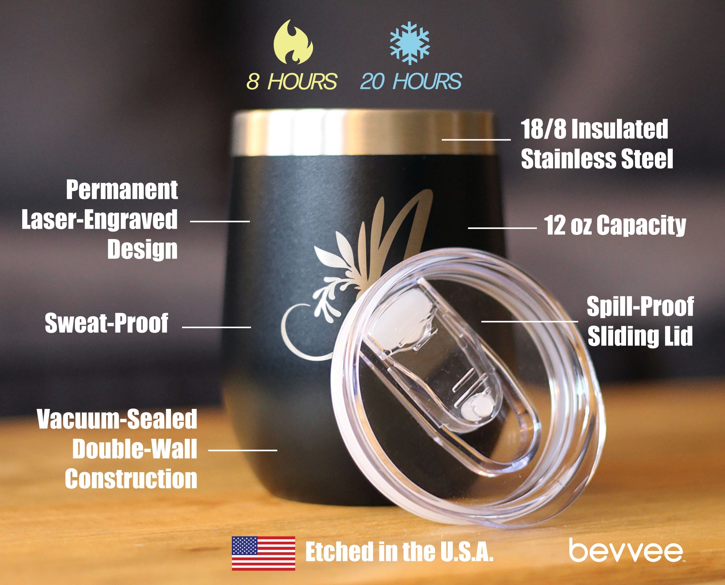 Our 12oz. stemless wine tumblers with sliding lids feature stainless steel double-wall construction, vacuum insulated for 2X cold and heat retention compared to glass or plastic containers! Etched in America.