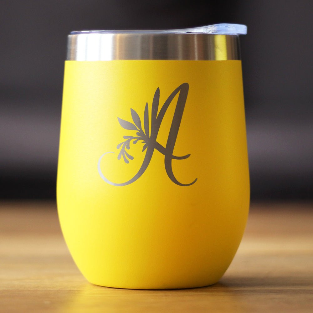 Monogram Floral Initial Letter A - Wine Tumbler ‐ Yellow