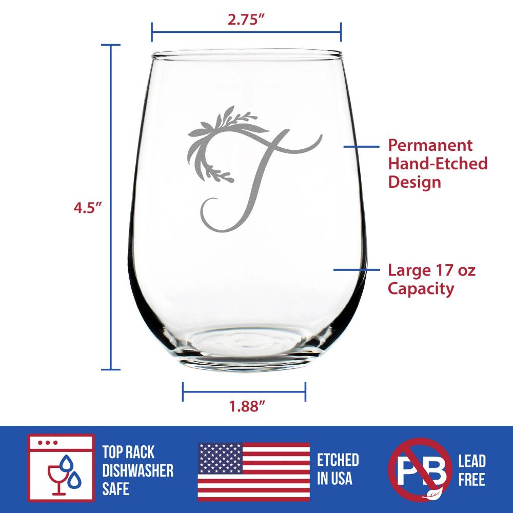 Monogram Floral Letter T - Stemless Wine Glass - Personalized Gifts for Women and Men - Large Engraved 17 Oz Glasses