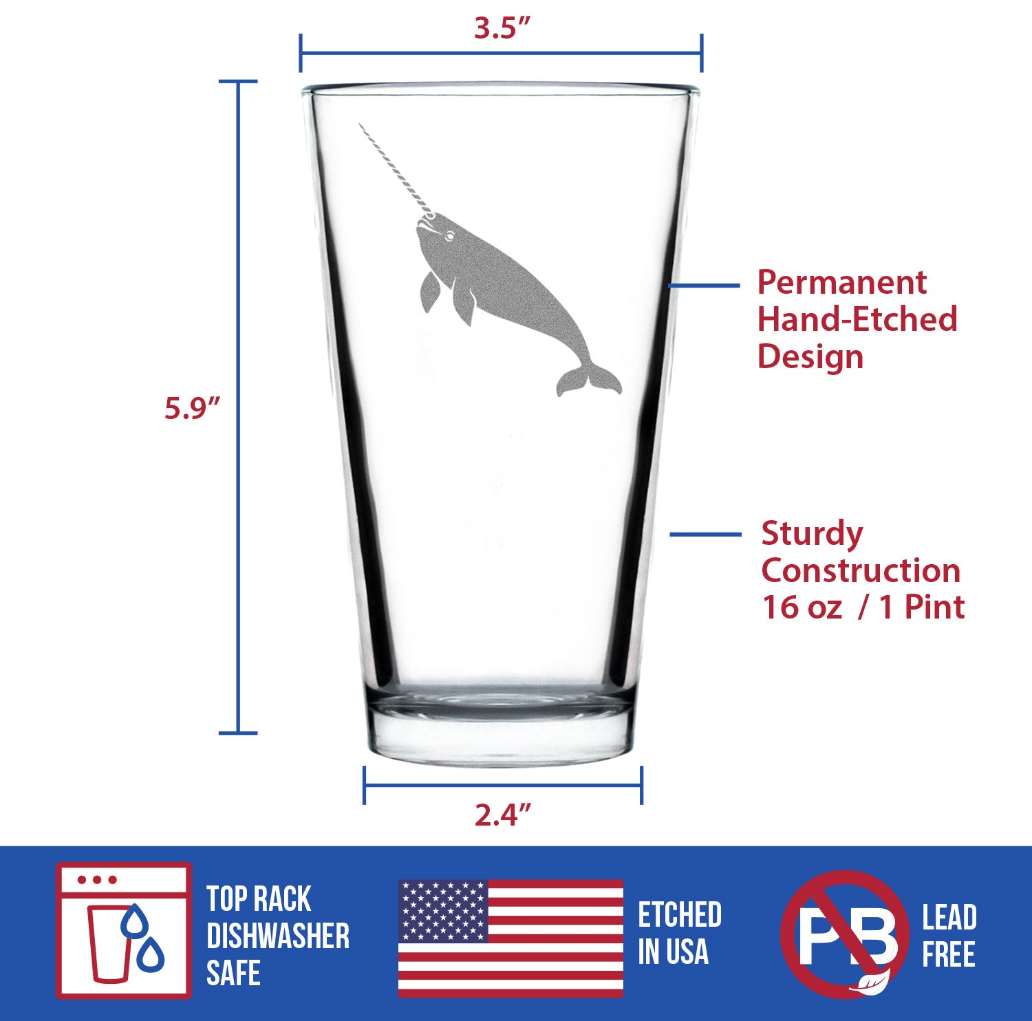 Narwhal Engraved Pint Glass Narwhal Gifts for Women High Quality Pint Glasses for Beer - 16oz