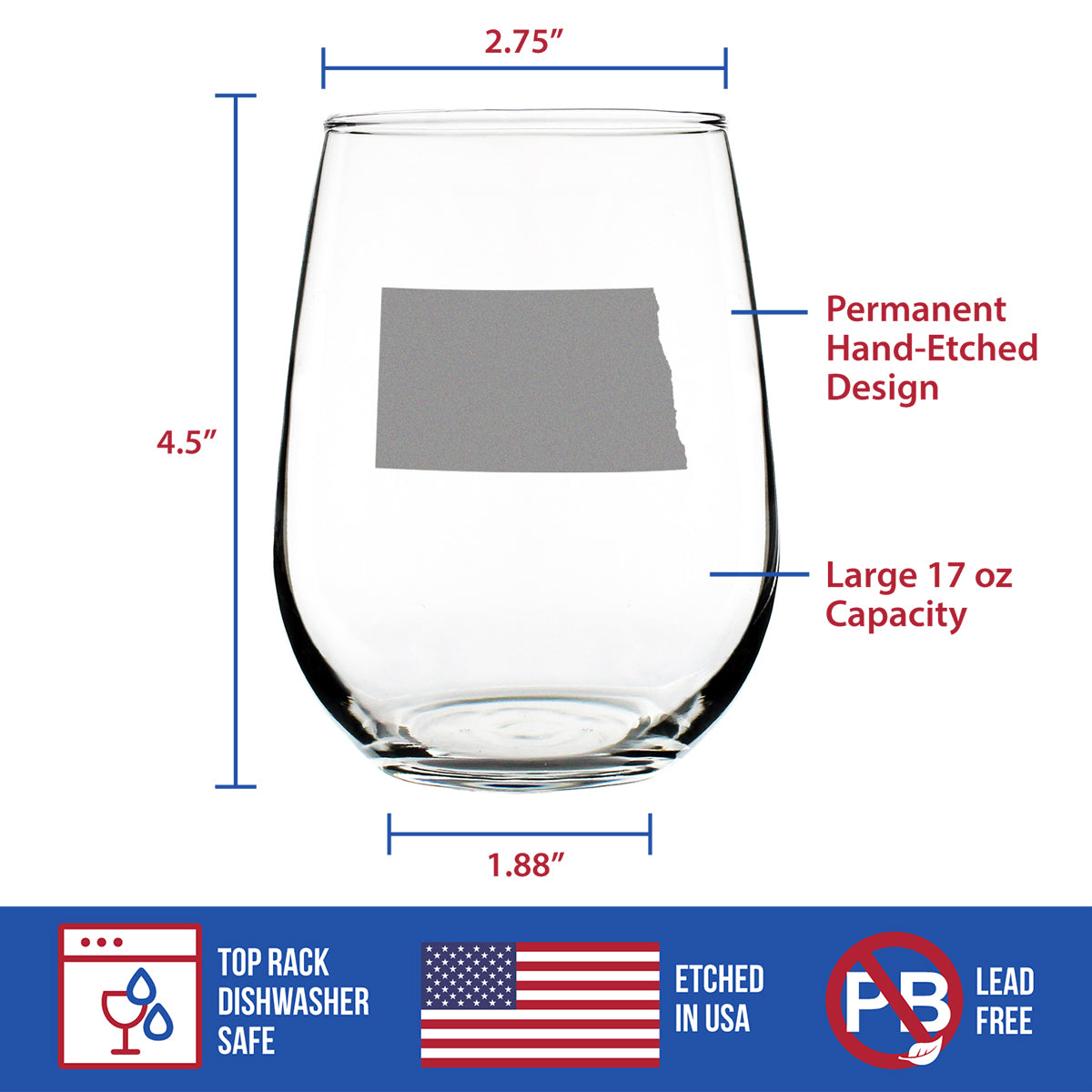 North Dakota State Outline Stemless Wine Glass - State Themed Drinking Decor and Gifts for North Dakotan Women & Men - Large 17 Oz Glasses