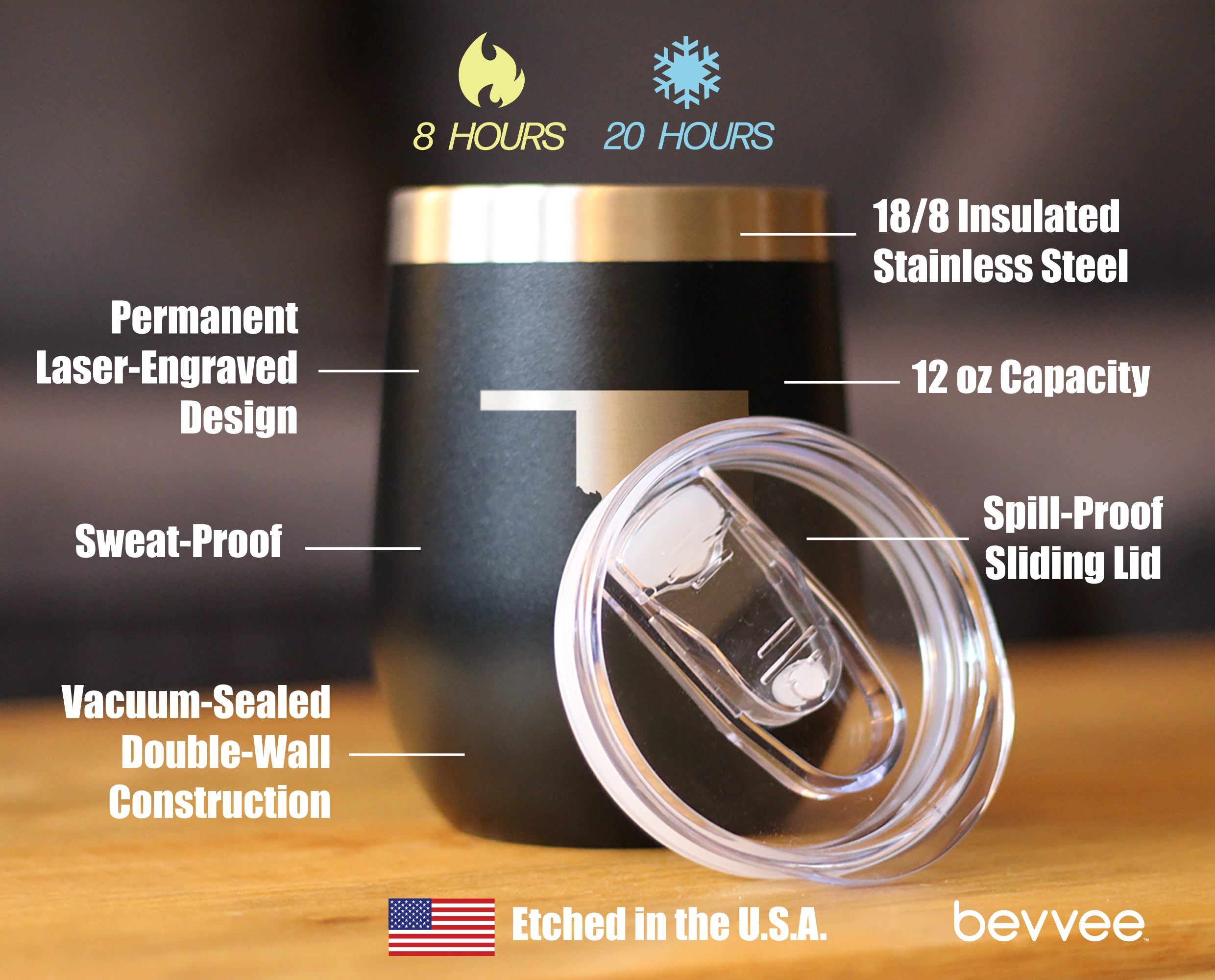 Our 12oz. stemless wine tumblers with sliding lids feature stainless steel double-wall construction, vacuum insulated for 2X cold and heat retention compared to glass or plastic containers! Etched in America.