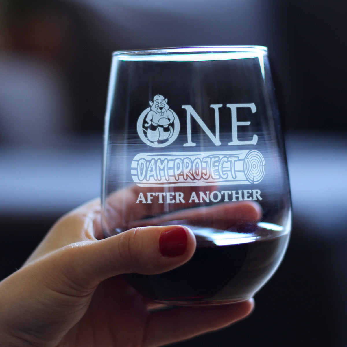 One Dam Project - Stemless Wine Glass - Funny Handyman Gifts for Construction Workers - Large 17 Ounce Glasses