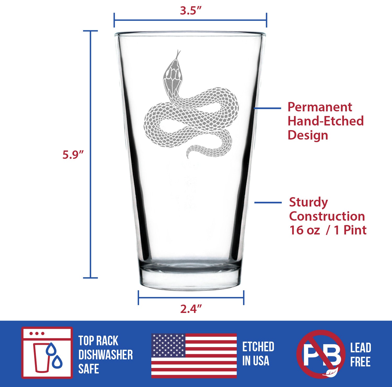 Snake Engraved Pint Glass Reptile Decor and Gifts for Snake Lovers High Quality Pint Glasses for Beer - 16oz