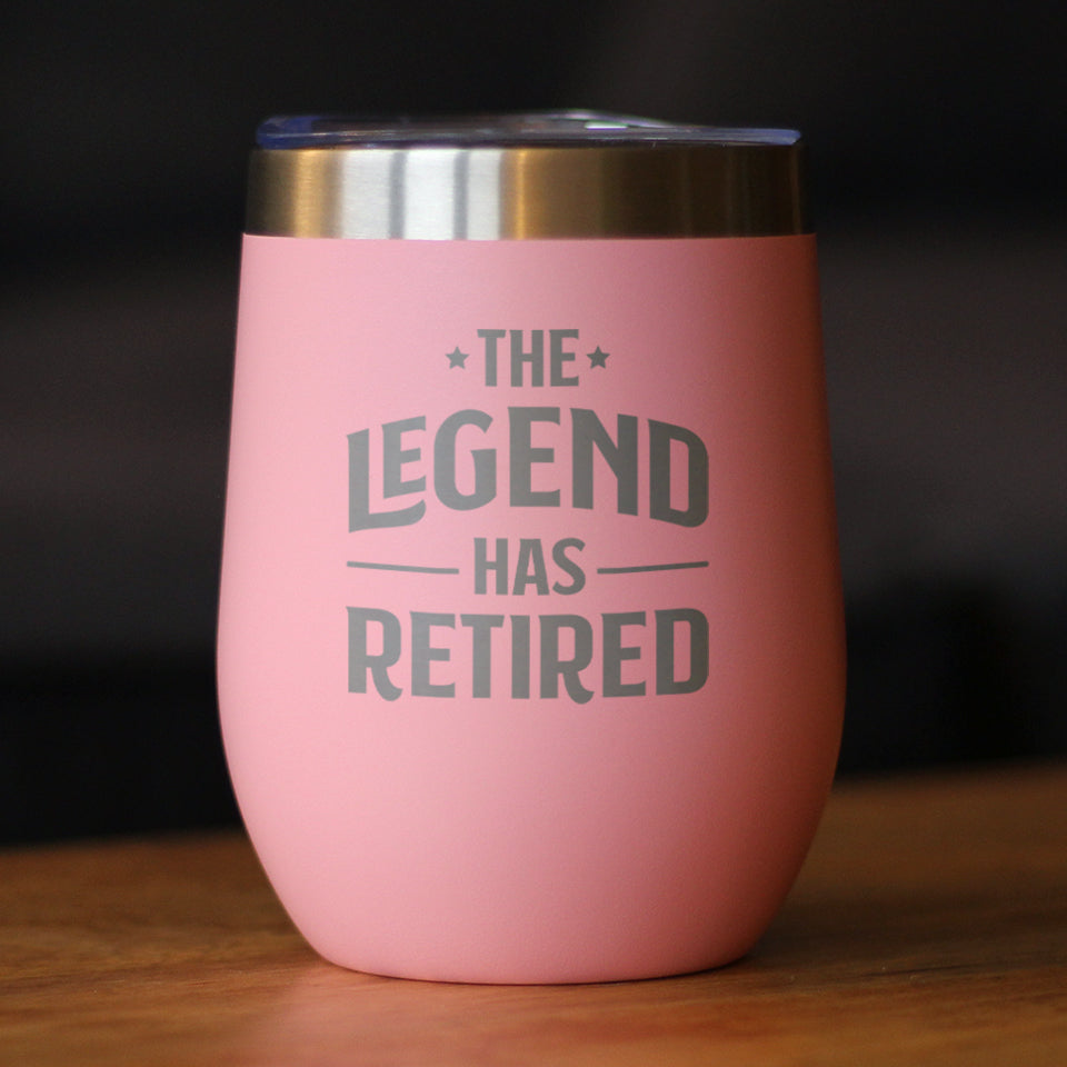 The Legend Has Retired - Wine Tumbler Glass with Sliding Lid - Stainless Steel Insulated Mug - Funny Retirement Gifts for Boss or Coworkers ‐ Pink