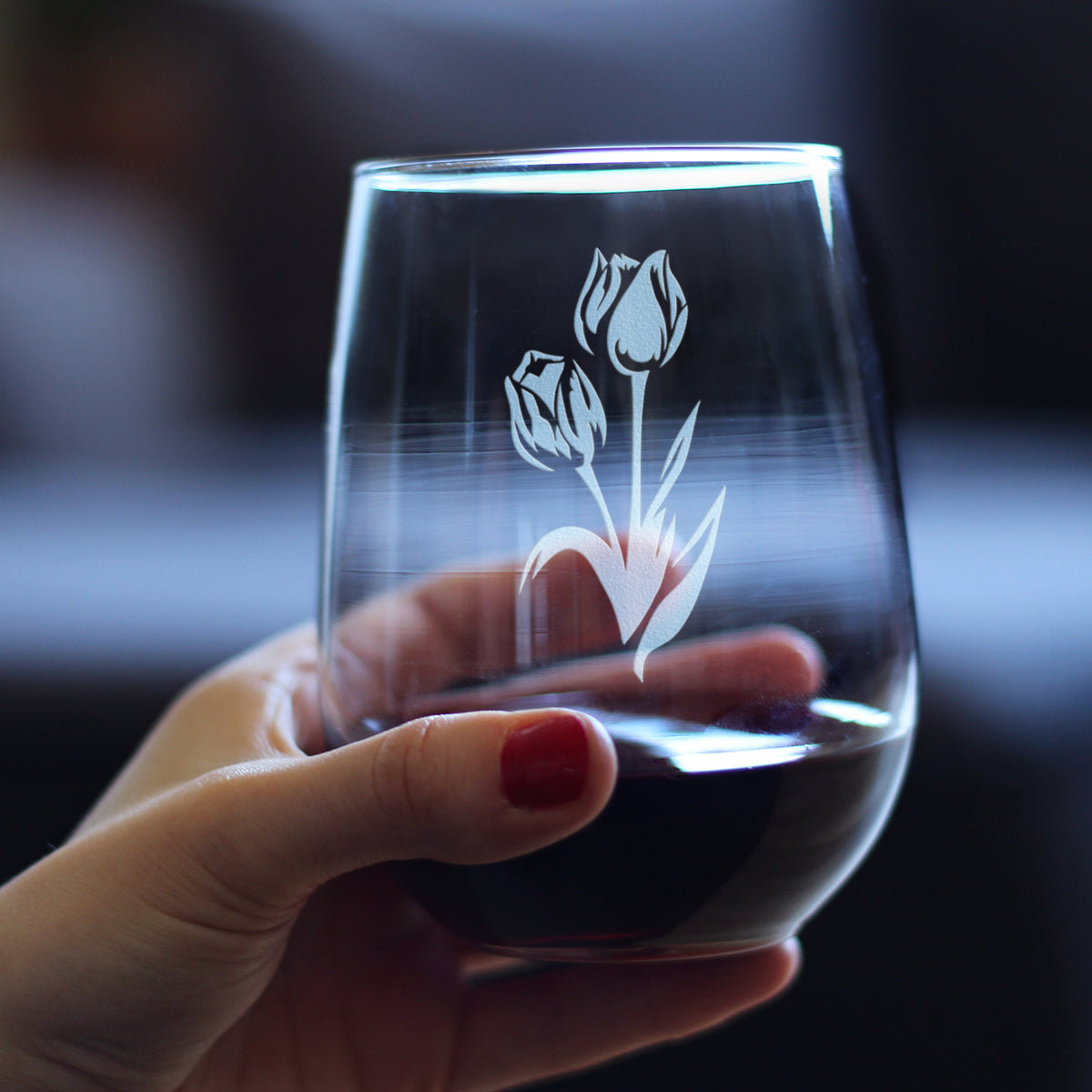 Tulip Stemless Wine Glass - Floral Themed Decor and Gifts for Flower Lovers - Large 17 Oz Glasses