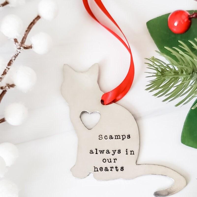 This listing is for one cat-shaped ornament that says your beloved cat's name and "always in our hearts" or your custom text.
