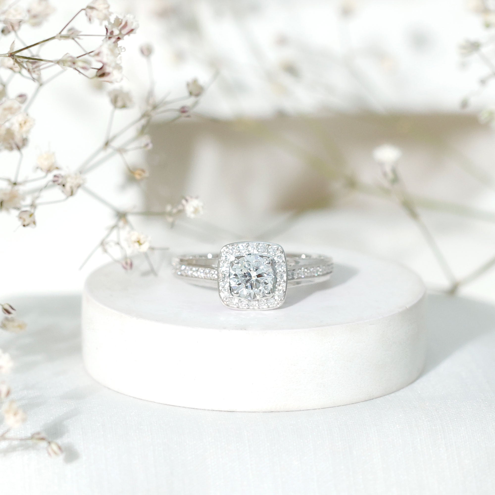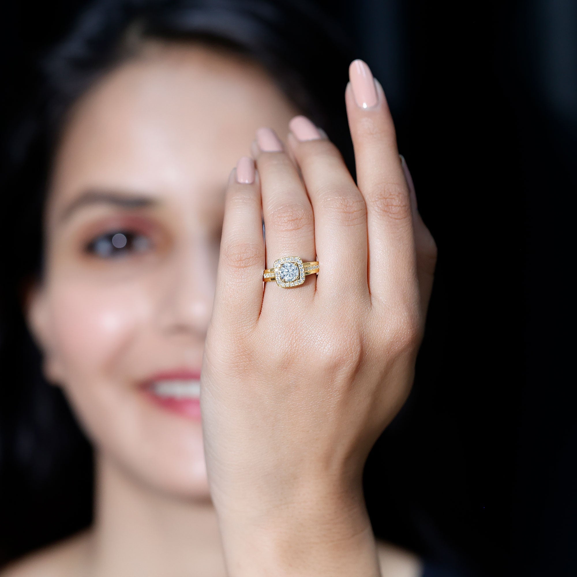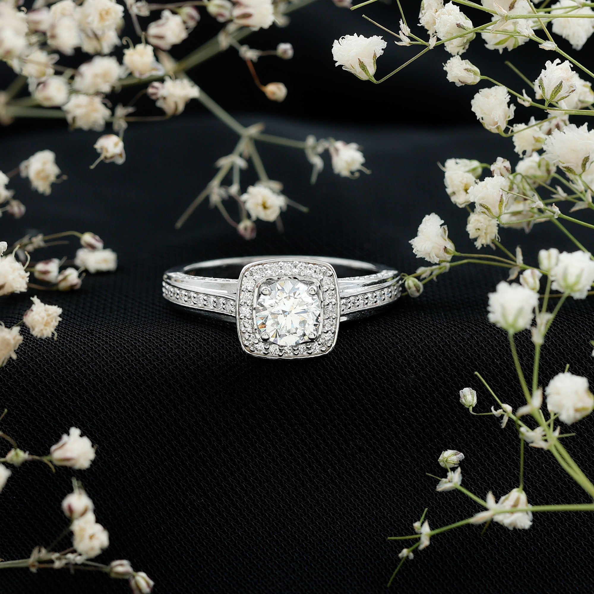 Having classic design and undeniable beauty this Lab Grown Diamond Ring has a captivating elegance and charm which is a symbol of everlasting love. The 6 MM Round Shaped Lab Grown Diamond in Prong Setting with the sparkling halo of Lab Diamond gemstones, beautifully creates a mesmerizing light and brilliance. The shank has decorated Lab Grown Diamond as Side Stones, seeking a vintage inspired and classic look. With a sophisticated style, this Halo Engagement Ring has a feminine aesthetic making it perfect for your special day. Plan your proposal with this thrilling Lab Diamond Engagement Ring that adds an extra layer of sophistication to this mesmerizing piece of jewelry.