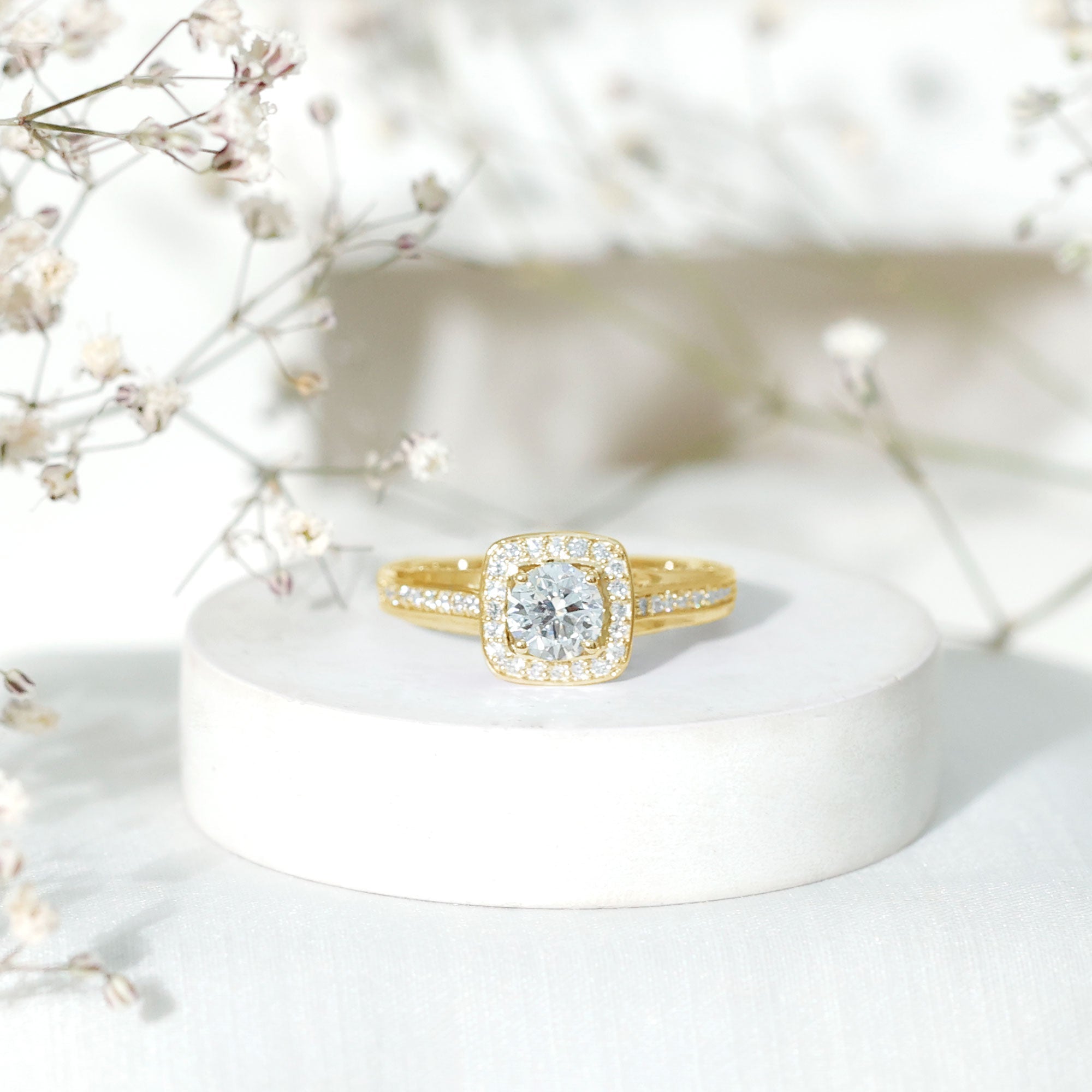 Certified 6 MM Lab Grown Diamond Halo Engagement Ring ‐ Lab - ( EF-VS ) / 18K Yellow Gold