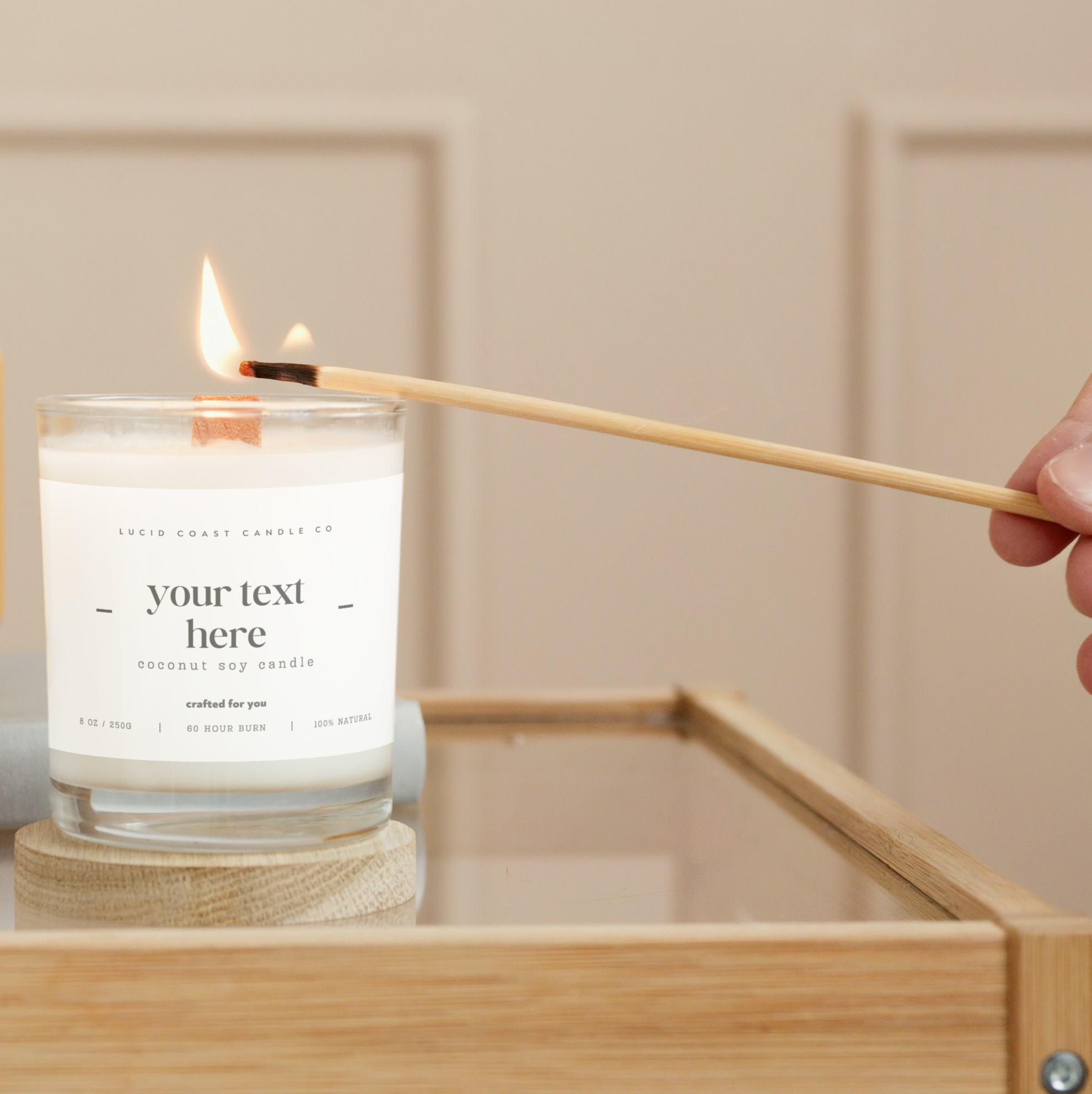 - Hand-poured 100% coconut-soy wax (clean burn, crackling wood wick)