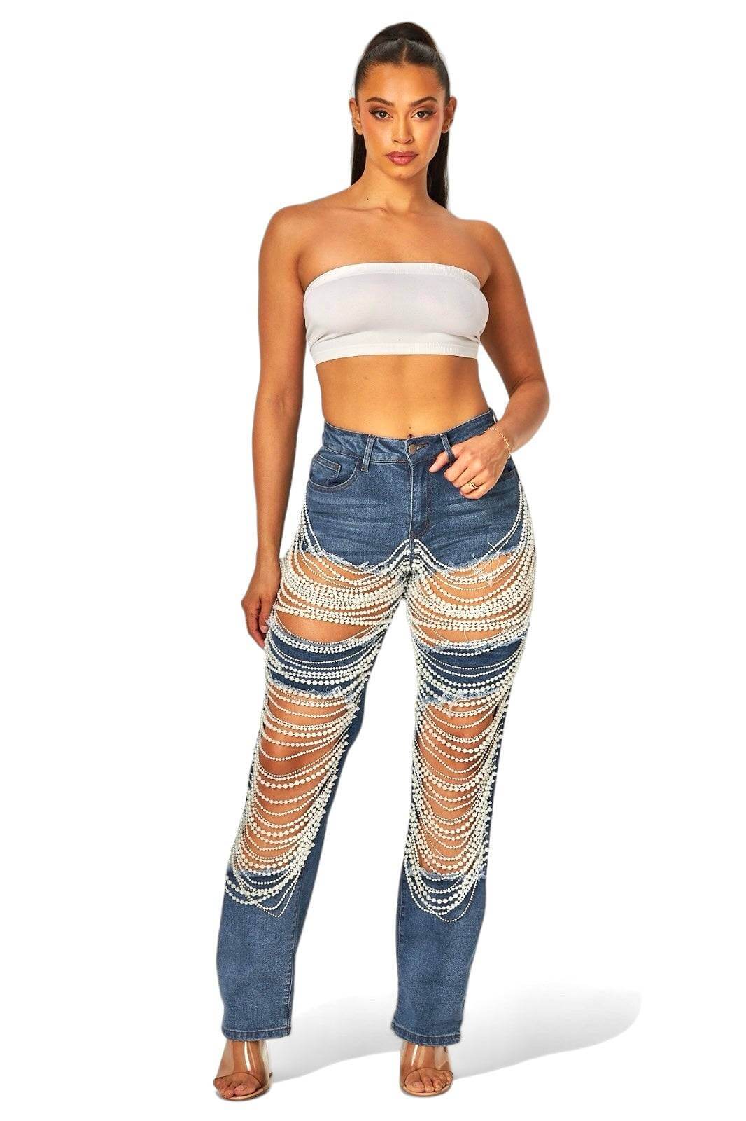 Elevate your denim game with our Pearl Detail Denim Pants! Featuring pearl detailing throughout the legs, these distressed medium & dark denim pants are perfect for any occasion. With a flattering high waist, zip-up front, and stretchy fabric, these straight leg Pearl detail denim pants will be your new go-to for style and comfort.
