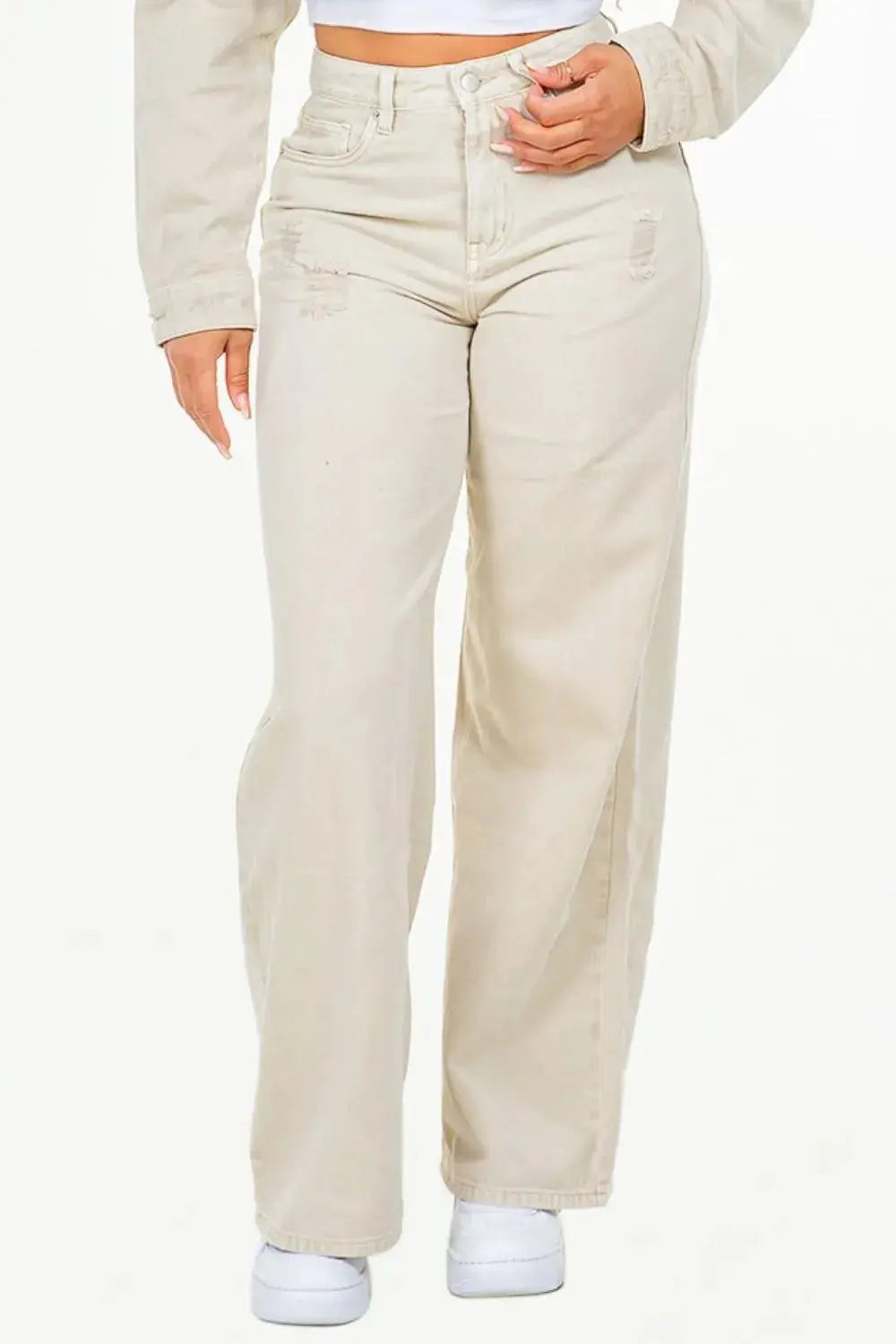 American Bazi High Waist Distressed Wide Leg Jeans - Women's Apparel & Accessories Clothing Pants ‐ Beige / 3