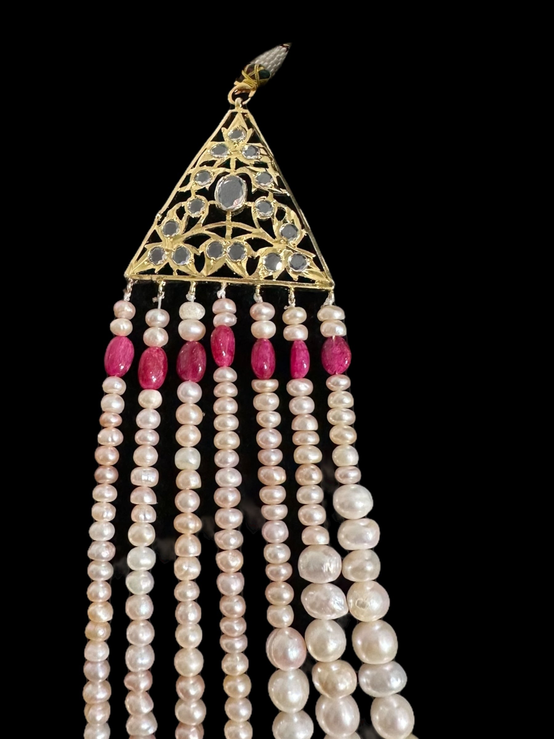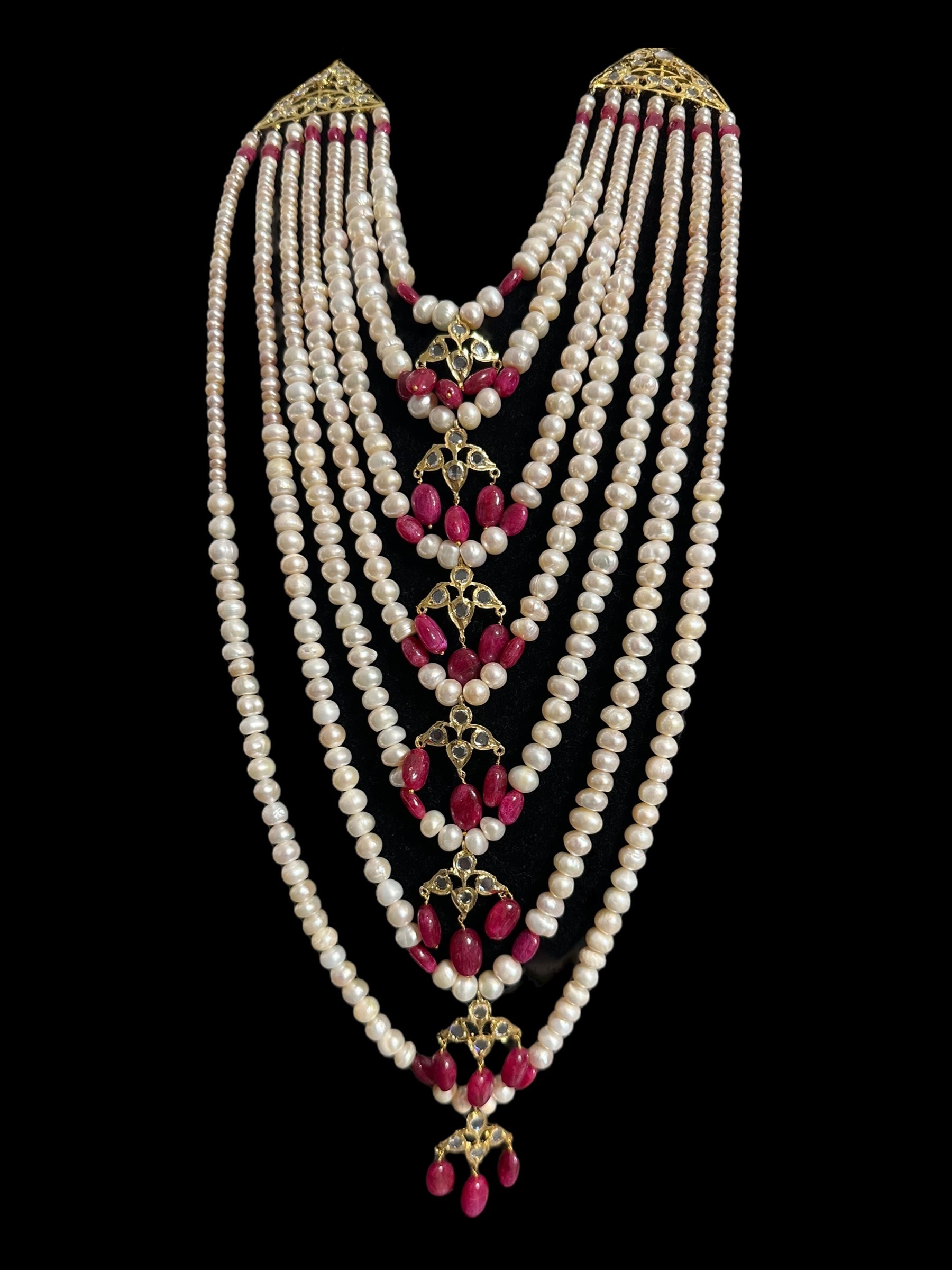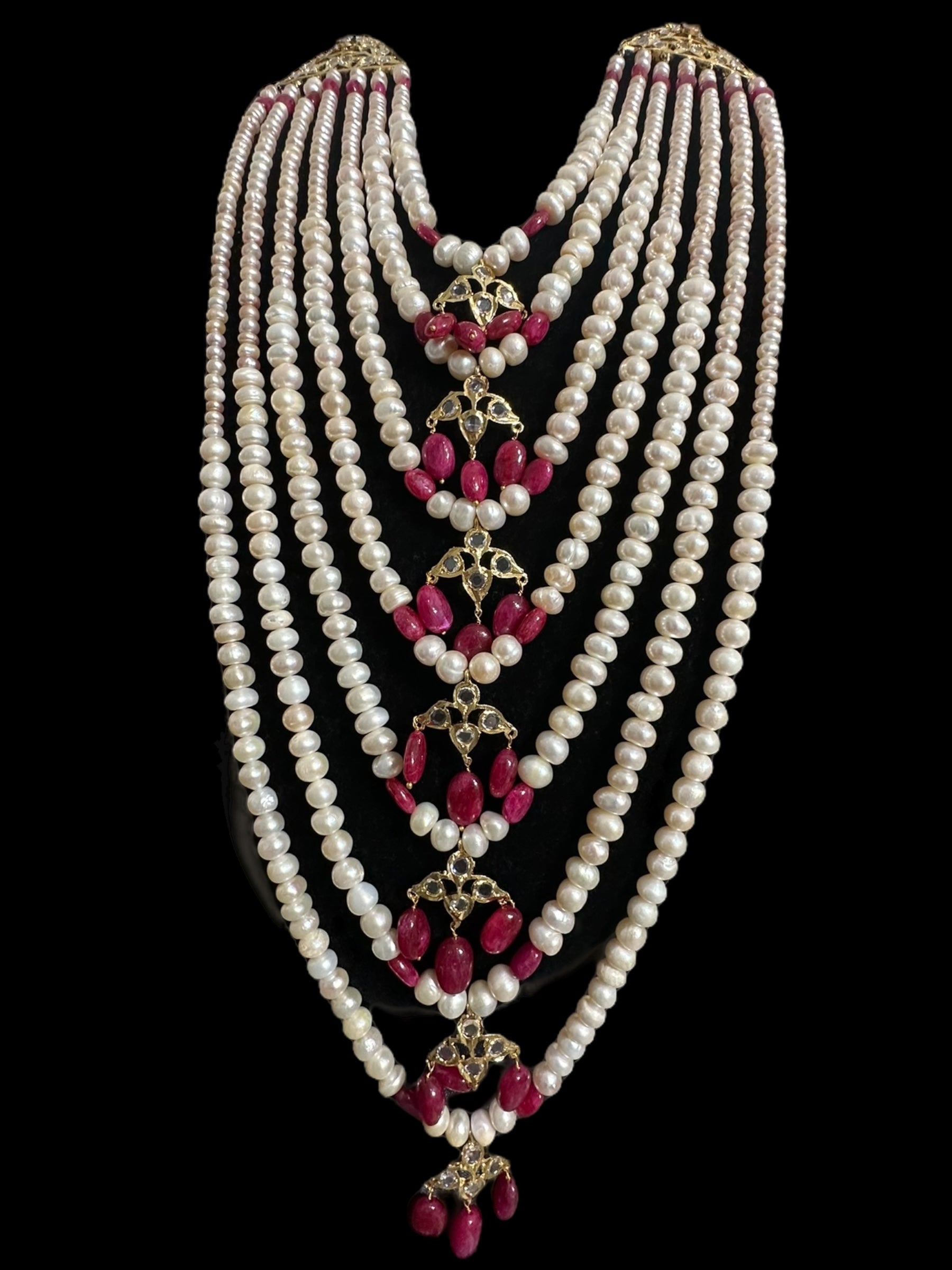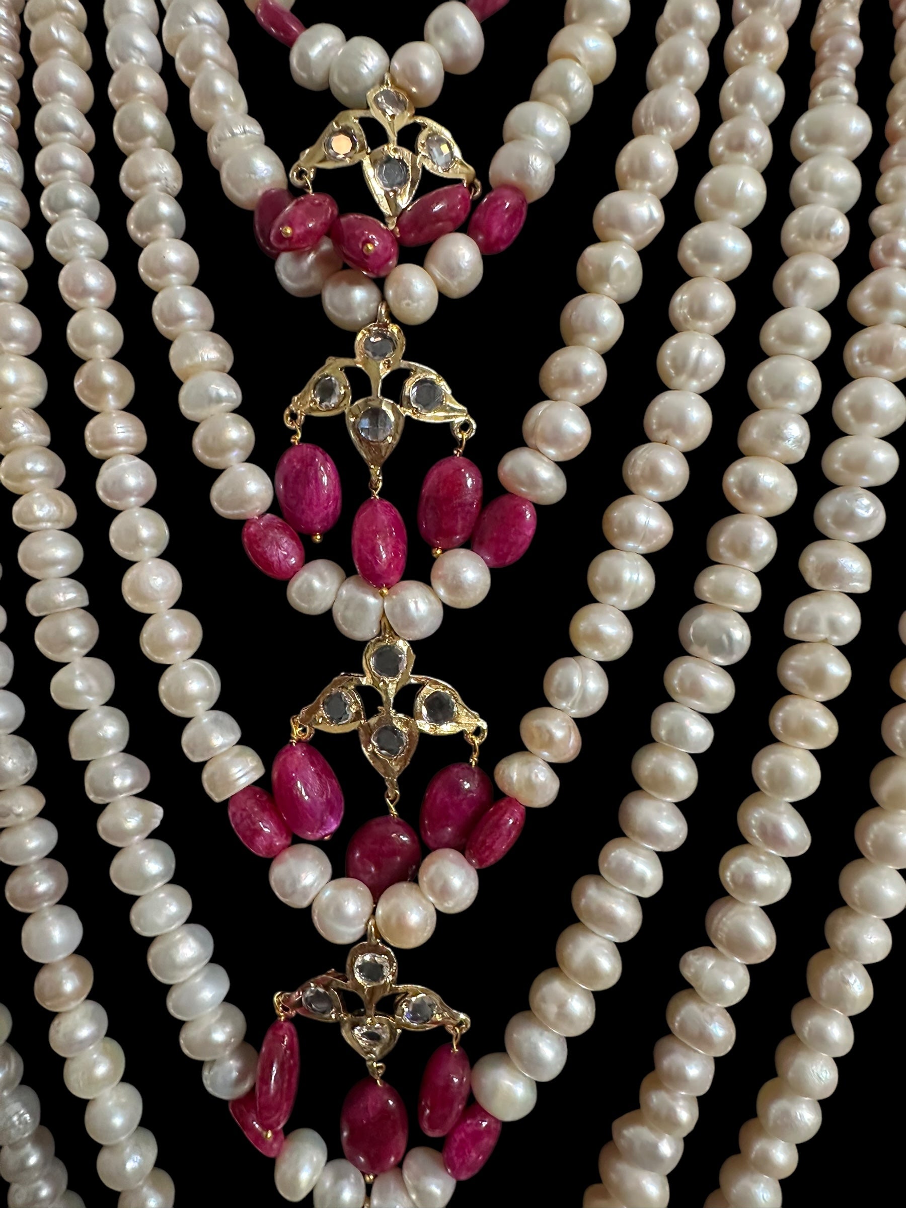 Made using fresh water pearls with clear Polki stones and ruby beads ,