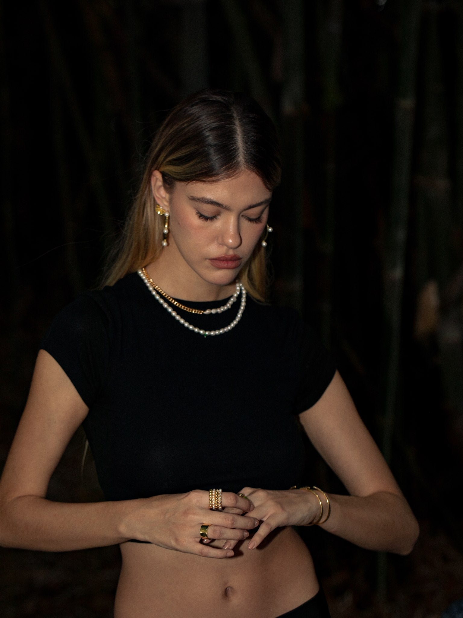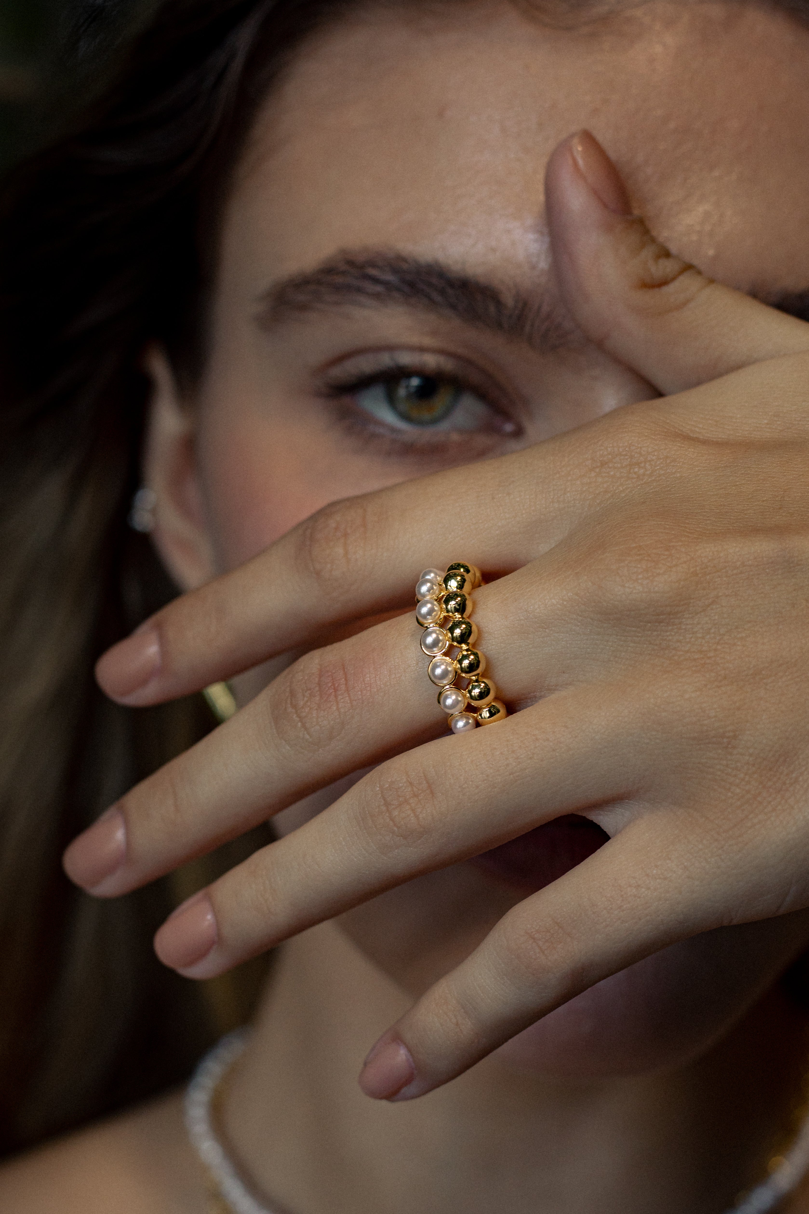Elevate your jewelry game with BRIGID, the perfect combination of elegance and boldness. Crafted with hypoallergenic 925 silver and 14k golddipped features, this pearl and bead ring is the epitome of style and comfort. Don't just make a statement, make a statement that shines with BRIGID!