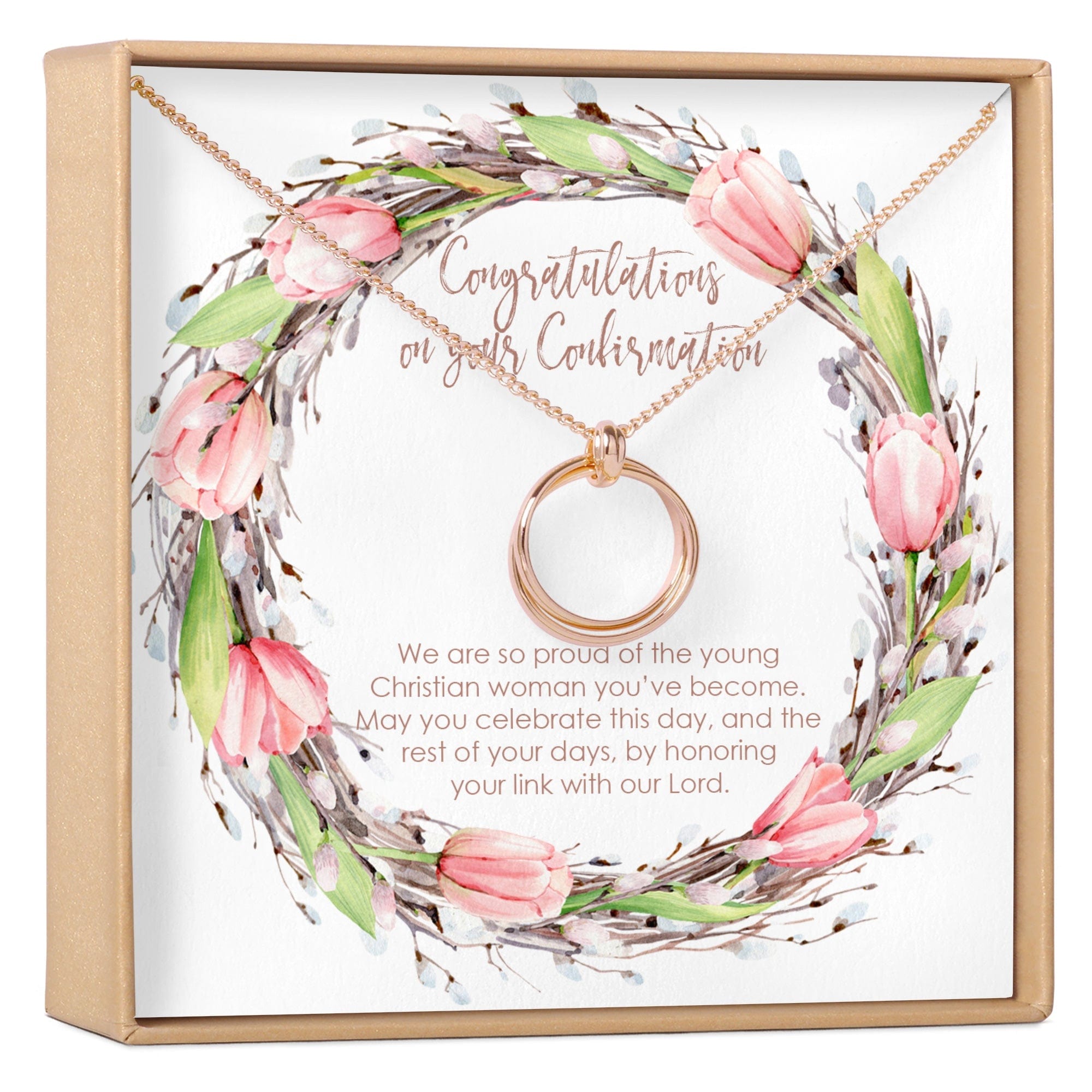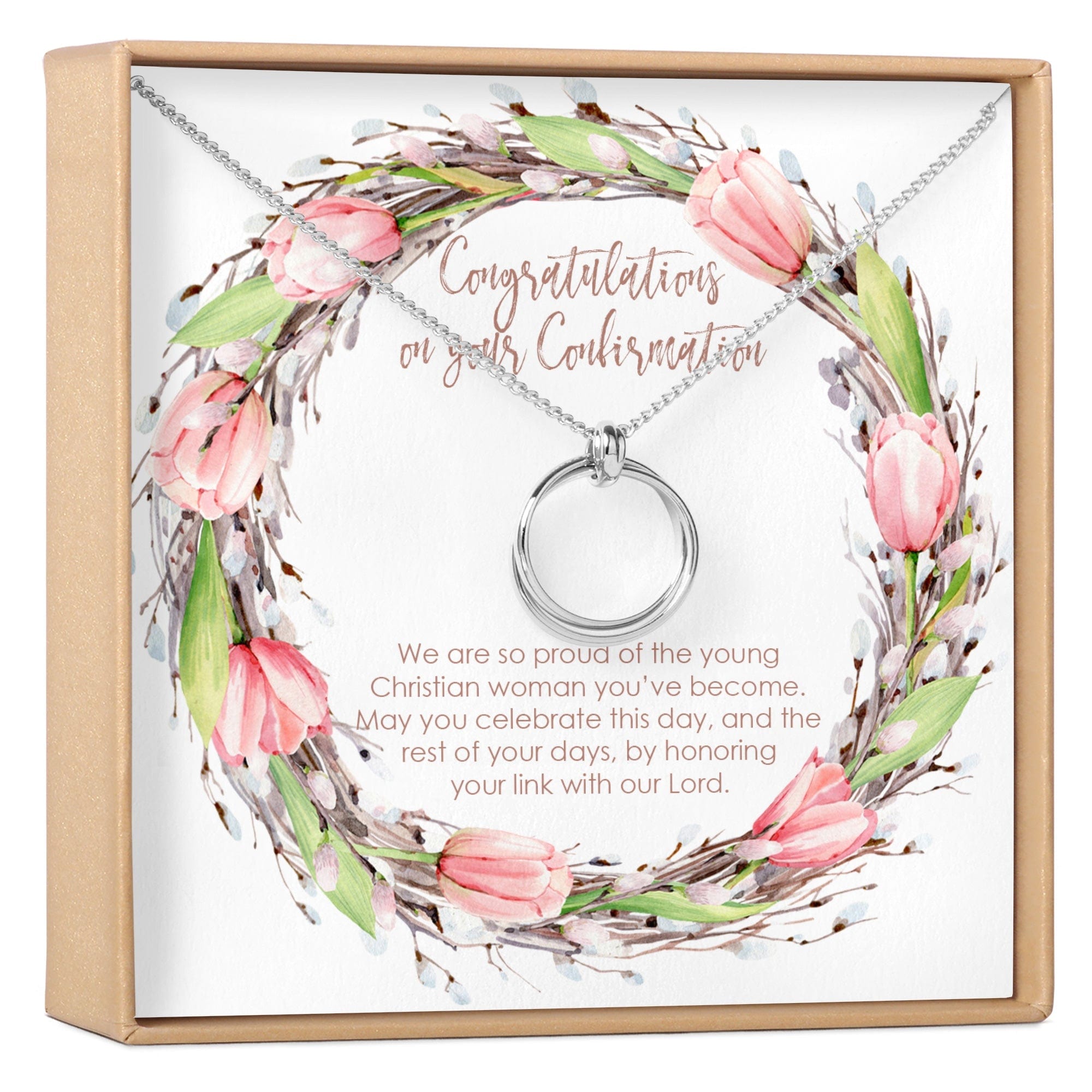 Show her you're proud of her on the occasion of her confirmation. This delicate necklace has a unique design yet remains elegant and timeless. The interlocking circles represent her link with God.