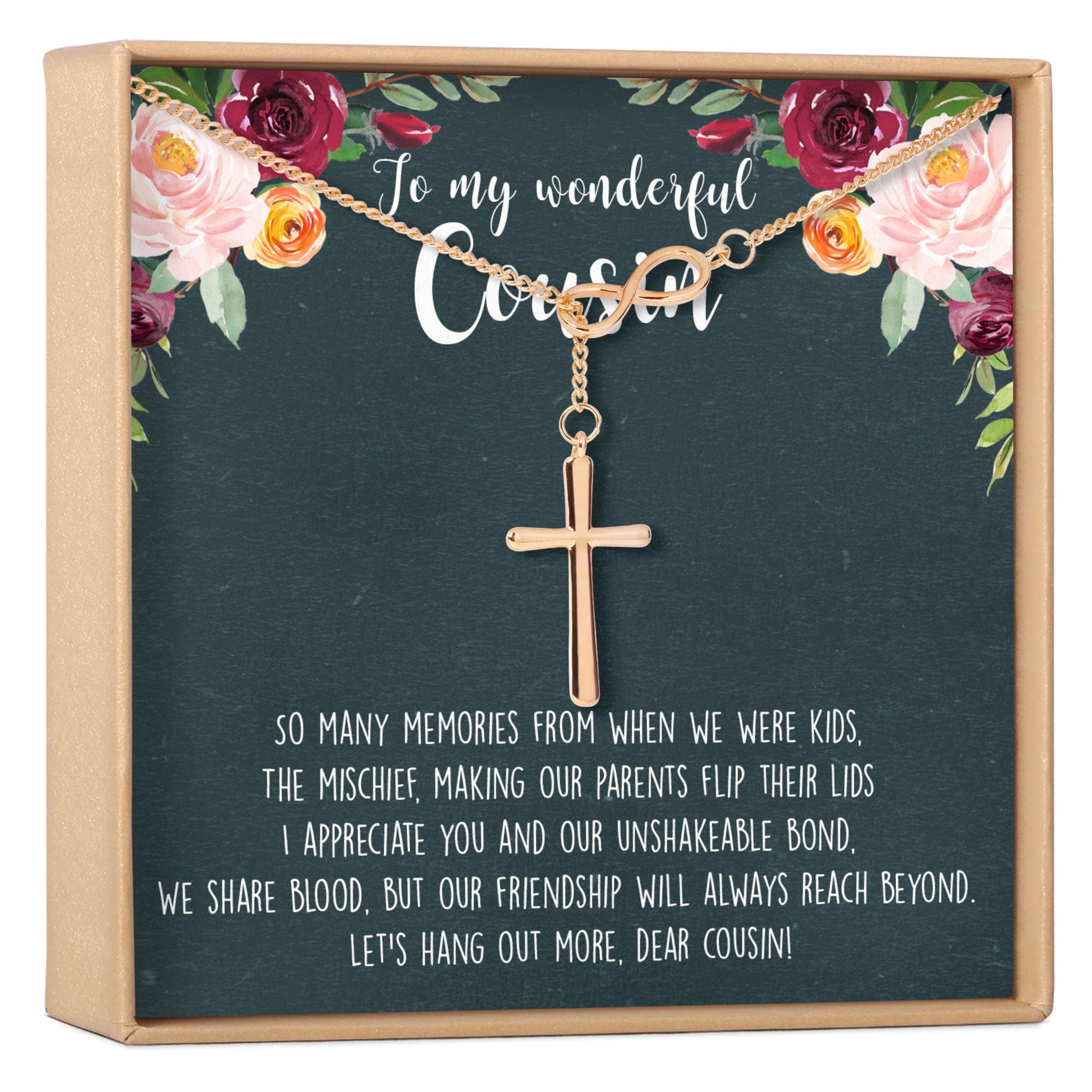 The love between cousins is forever. Show your love for Cousin with this beautiful infinity cross design symbolizing the connection between Cousins. This elegant piece is designed to shine and make your Cousin feel like the princess she really is.