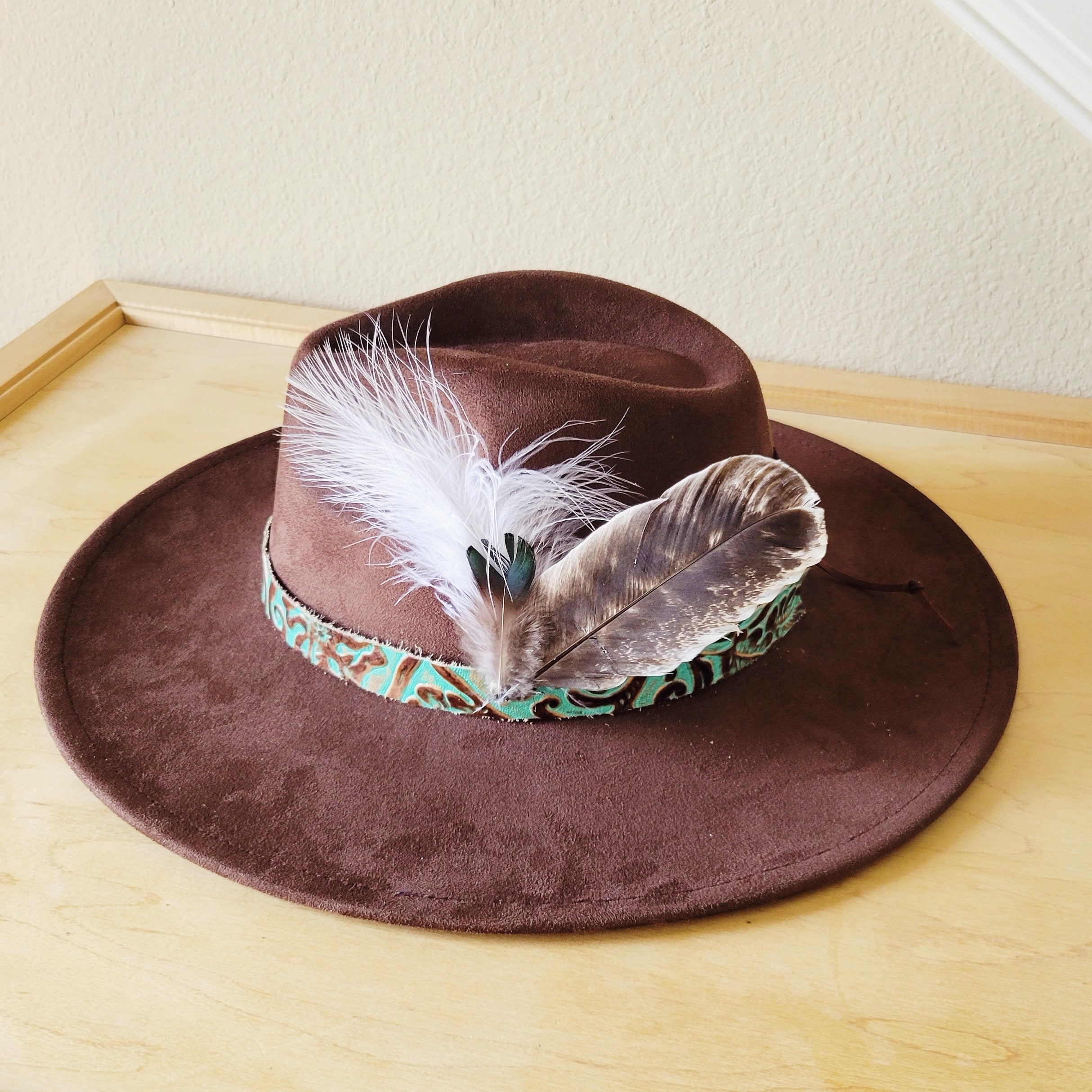 Cowboy Turquoise Leather Hat Band w/ Feather Accents 952g