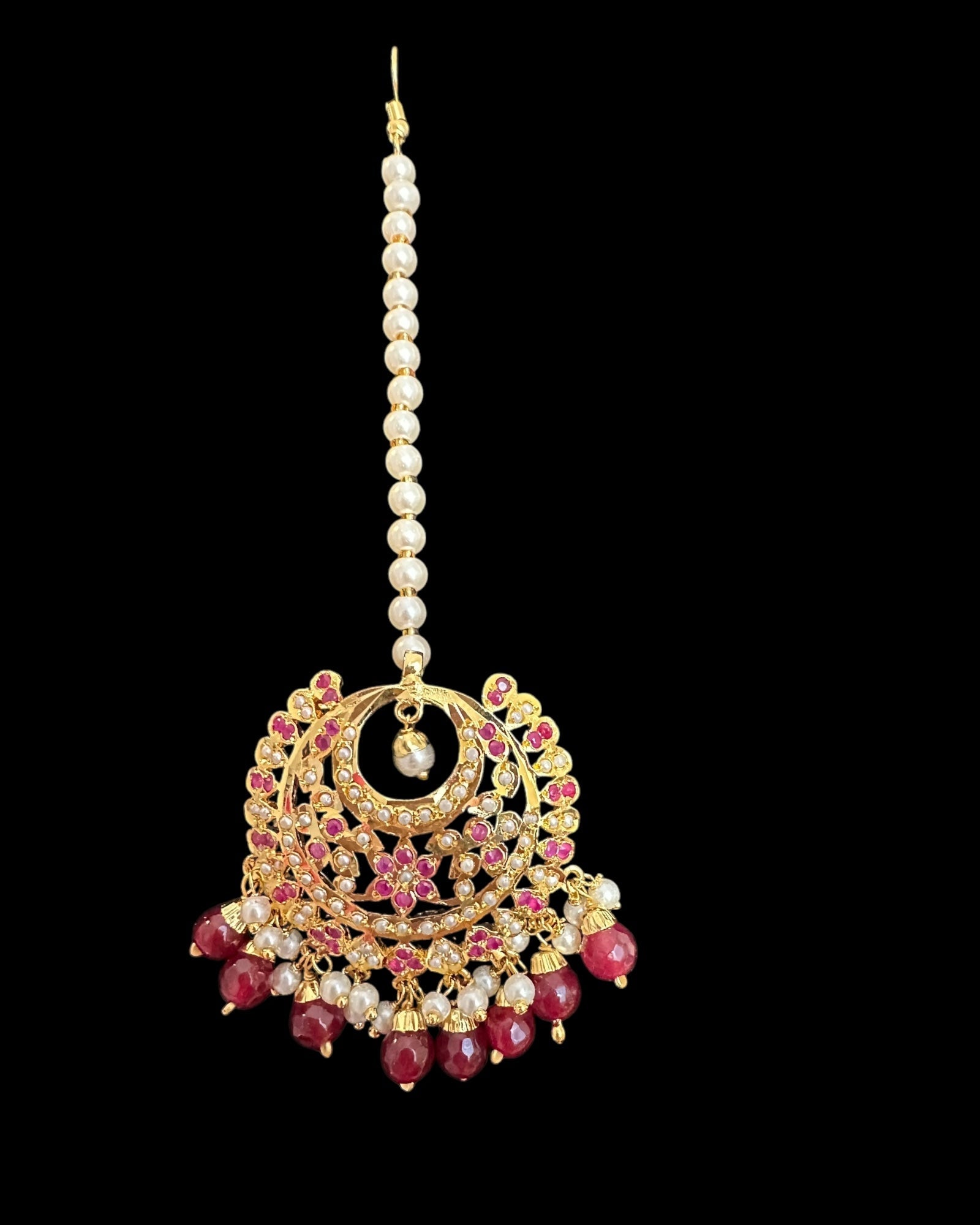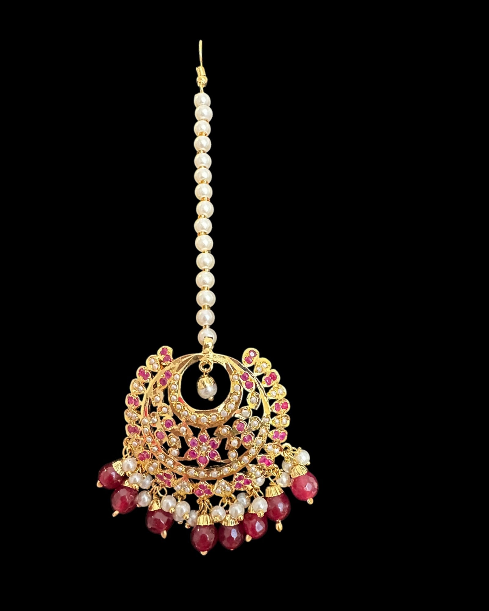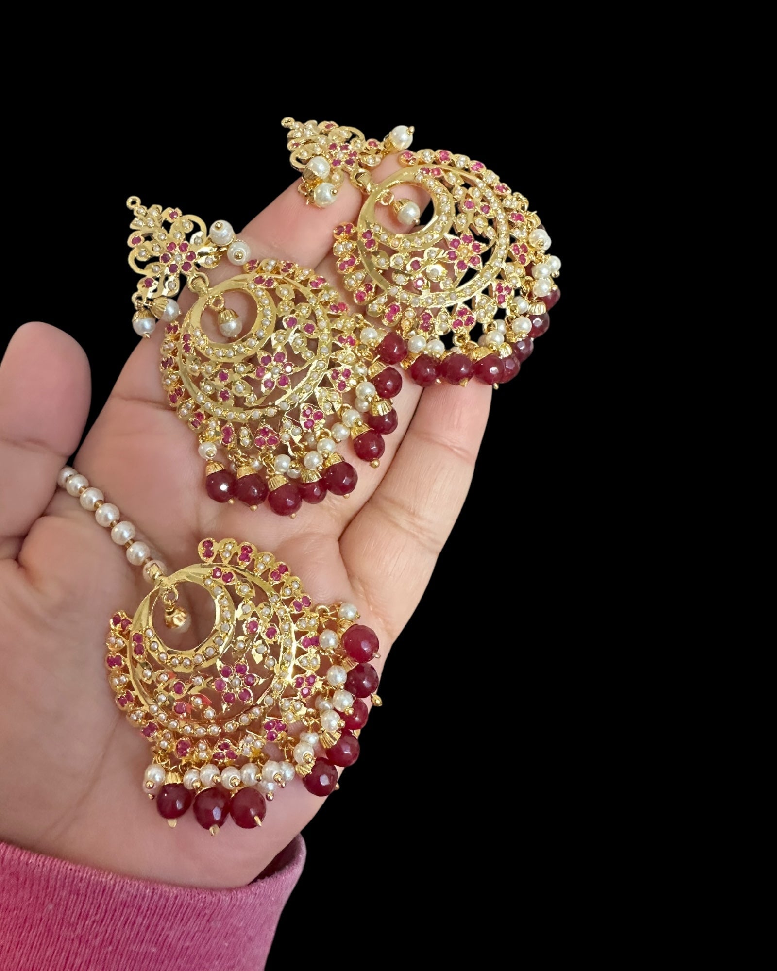 DJET86 Dafiya ruby pearl Chandbali Earrings & Tika Set | Ships in 4 weeks | Deccan Jewelry