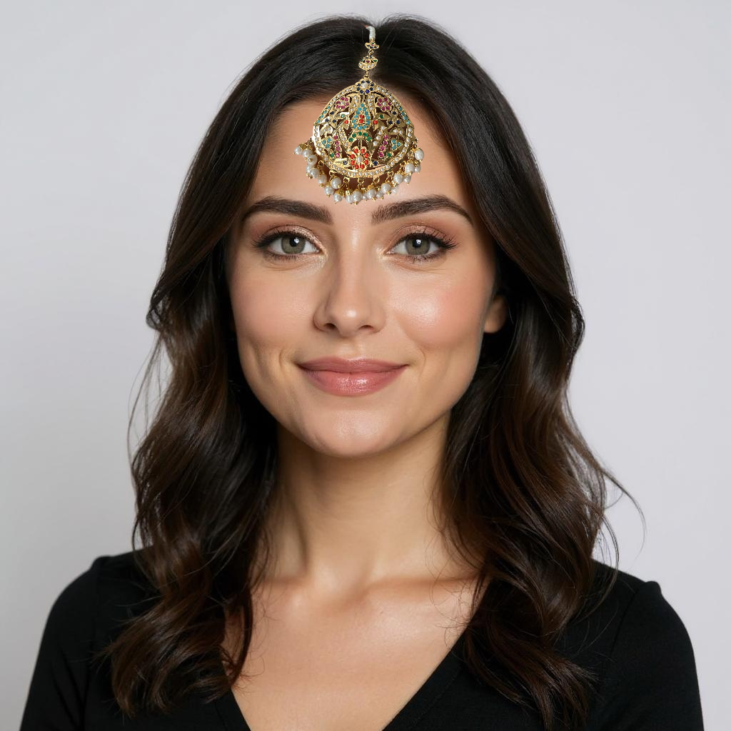 Step into a world of timeless elegance with the Samra Punjabi Tika in Navratan. This exquisite piece features nine auspicious gemstone tones, beautifully set in a gold-plated alloy base, symbolizing prosperity and vibrance. Delicate shell pearls add a soft, elegant touch, while the semi-precious stones bring color and brilliance.