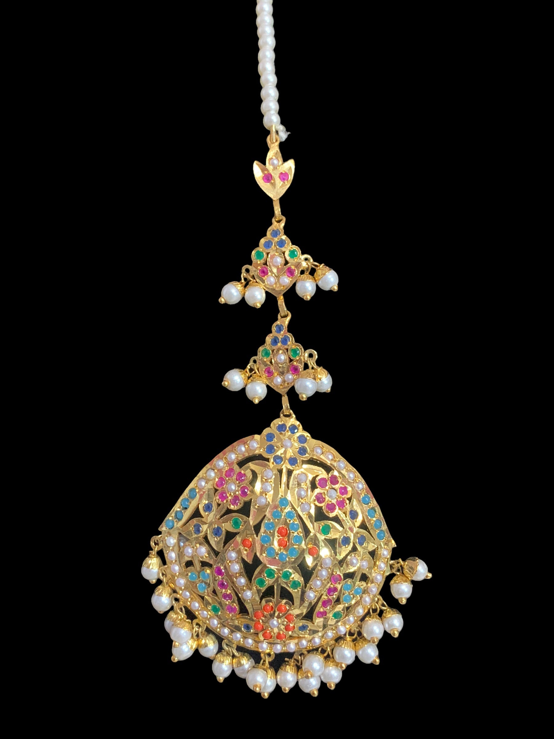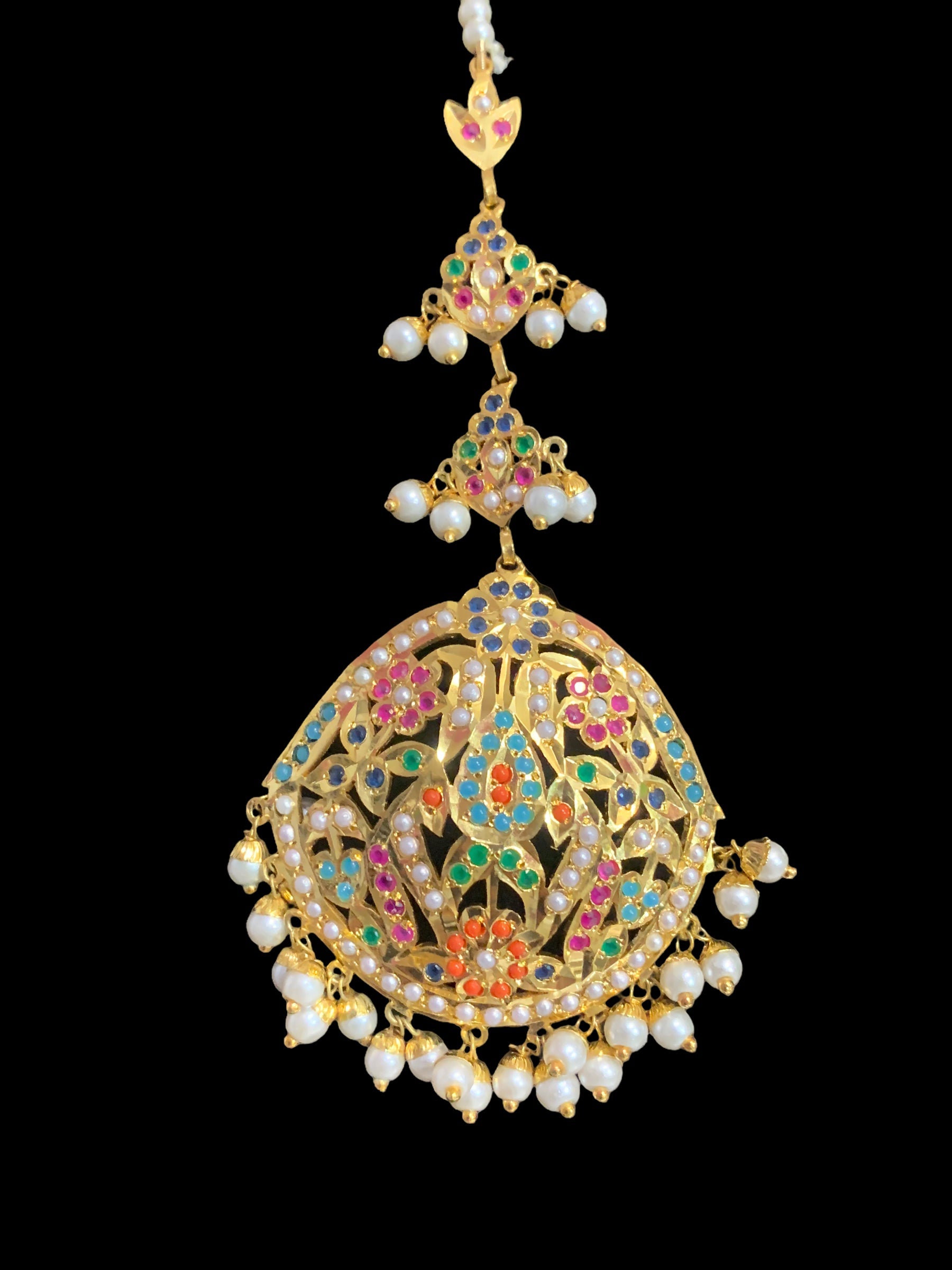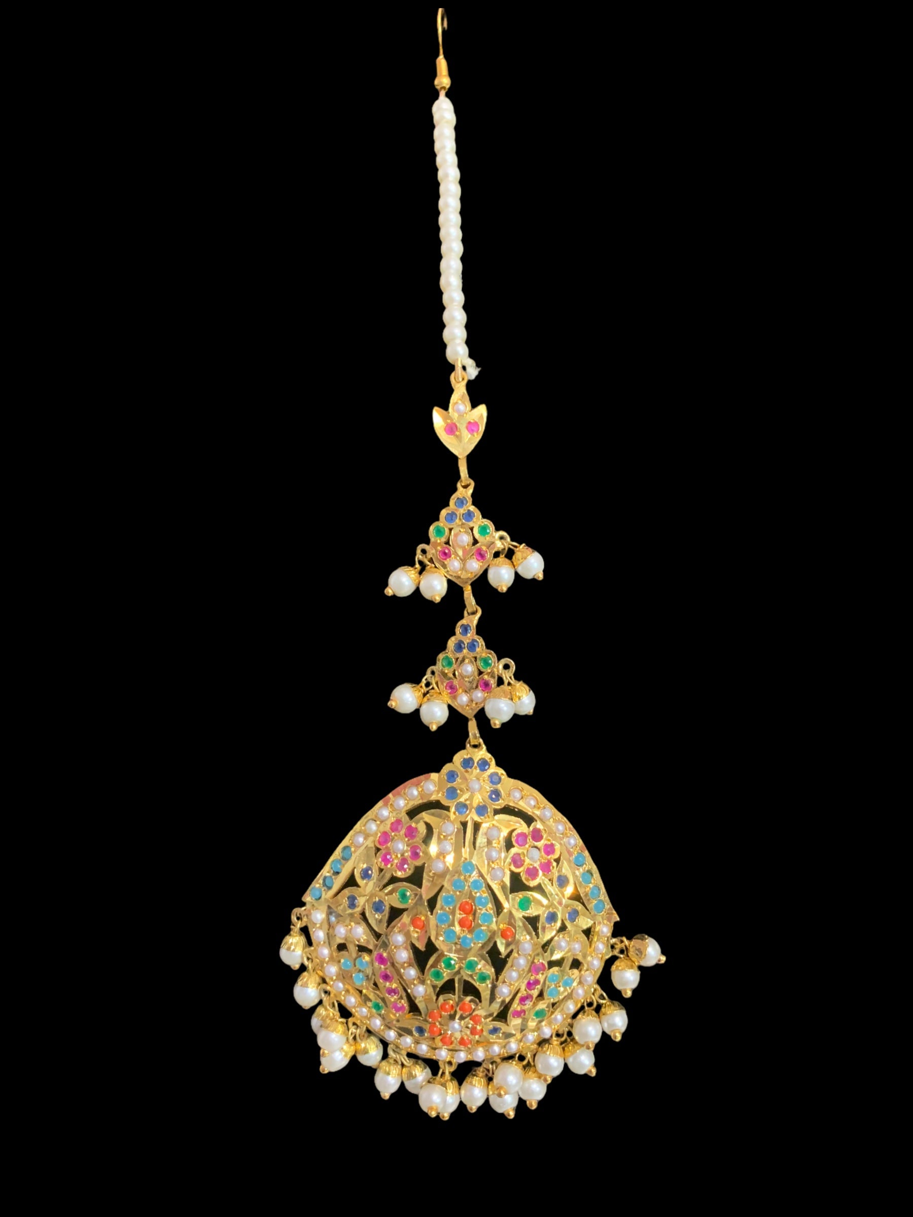 Punjabi tika, Navratan tika, gold plated tika, shell pearl jewelry, semi precious stone tika, bridal headpiece, traditional Punjabi jewelry, wedding tika, Indian hair accessories, Deccan Jewelry