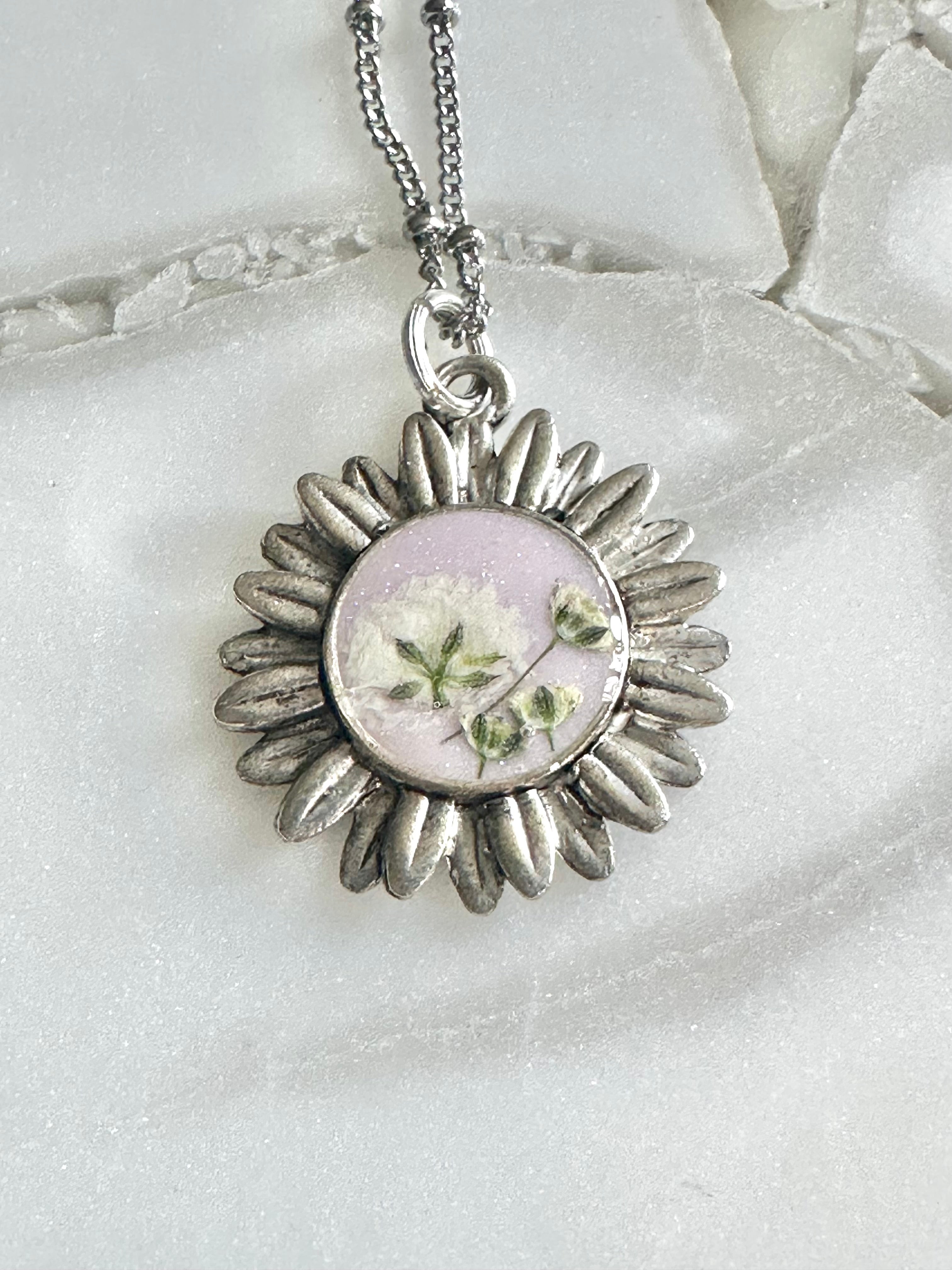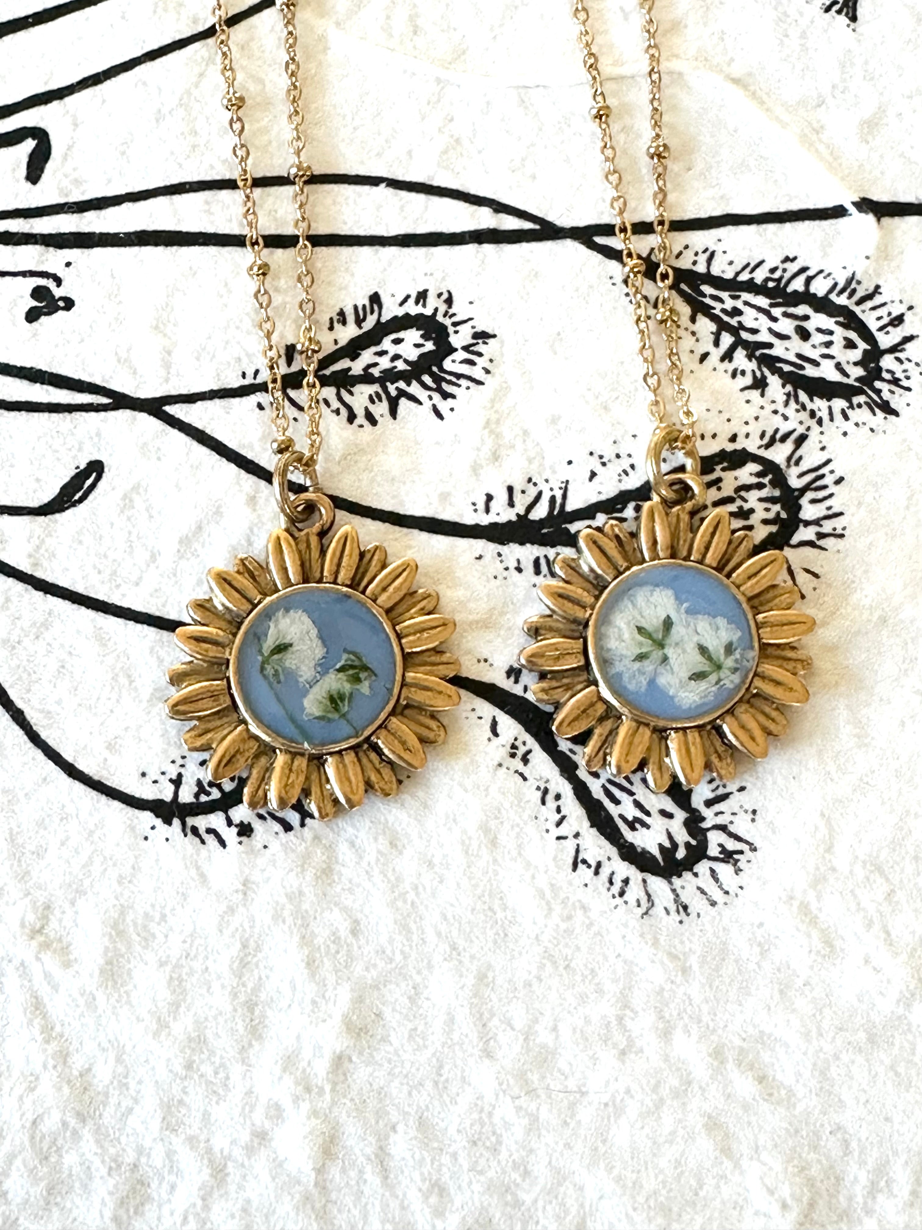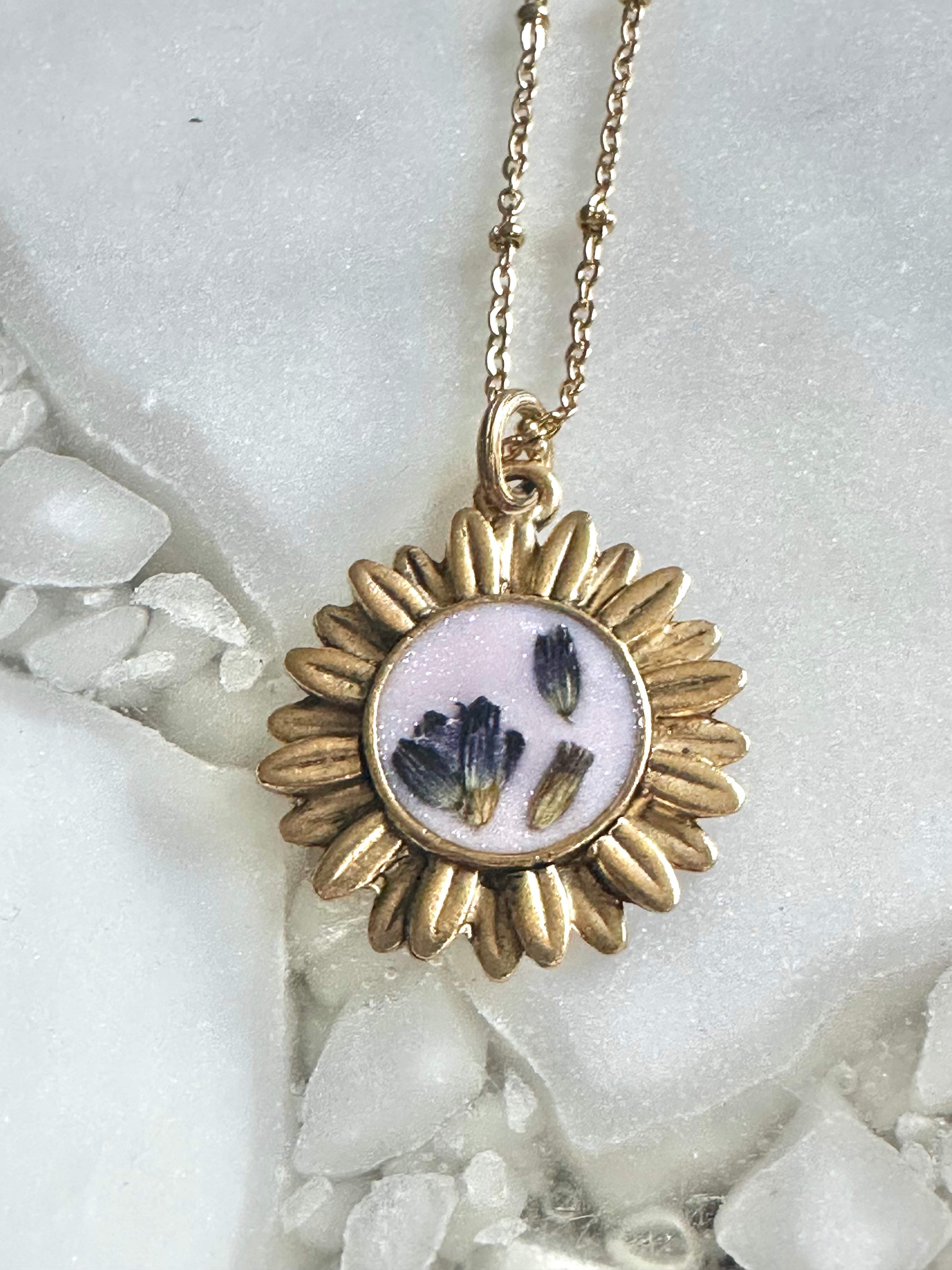 Harvested flowers from our garden. Set in hand pigmented resin. Flowers may differ in setting. Each is unique and will differ in shape and color making it a one of a kind necklace.