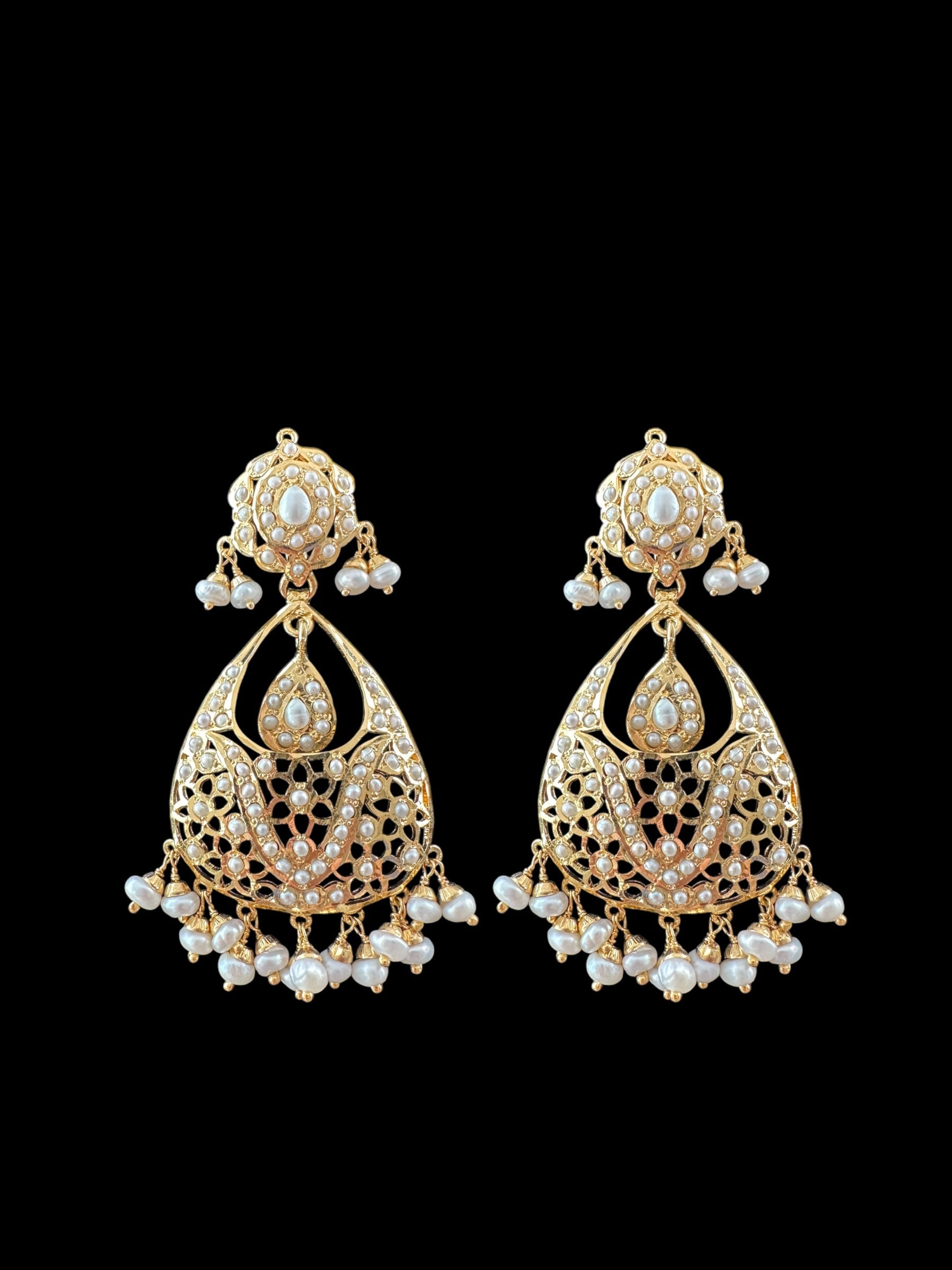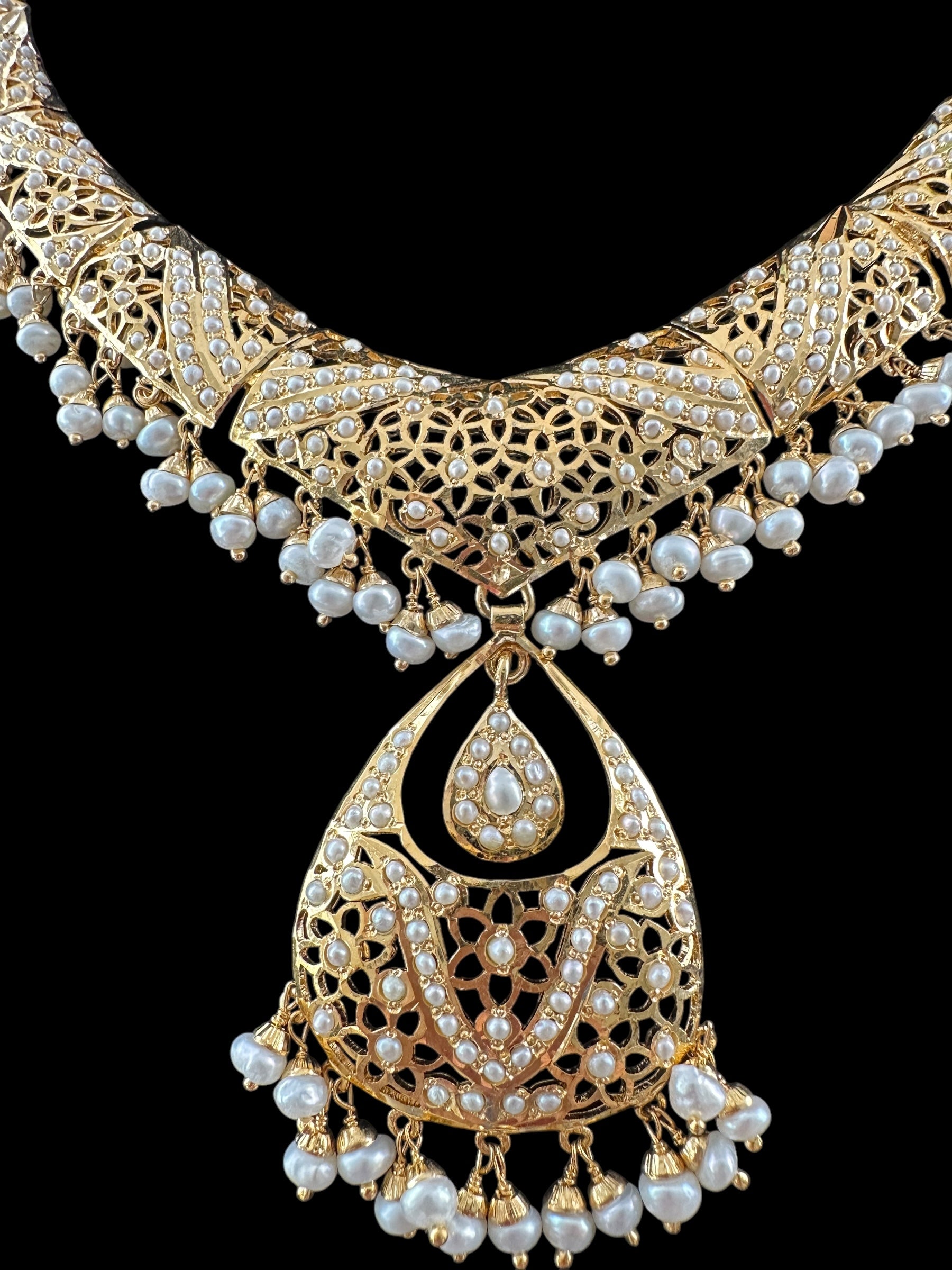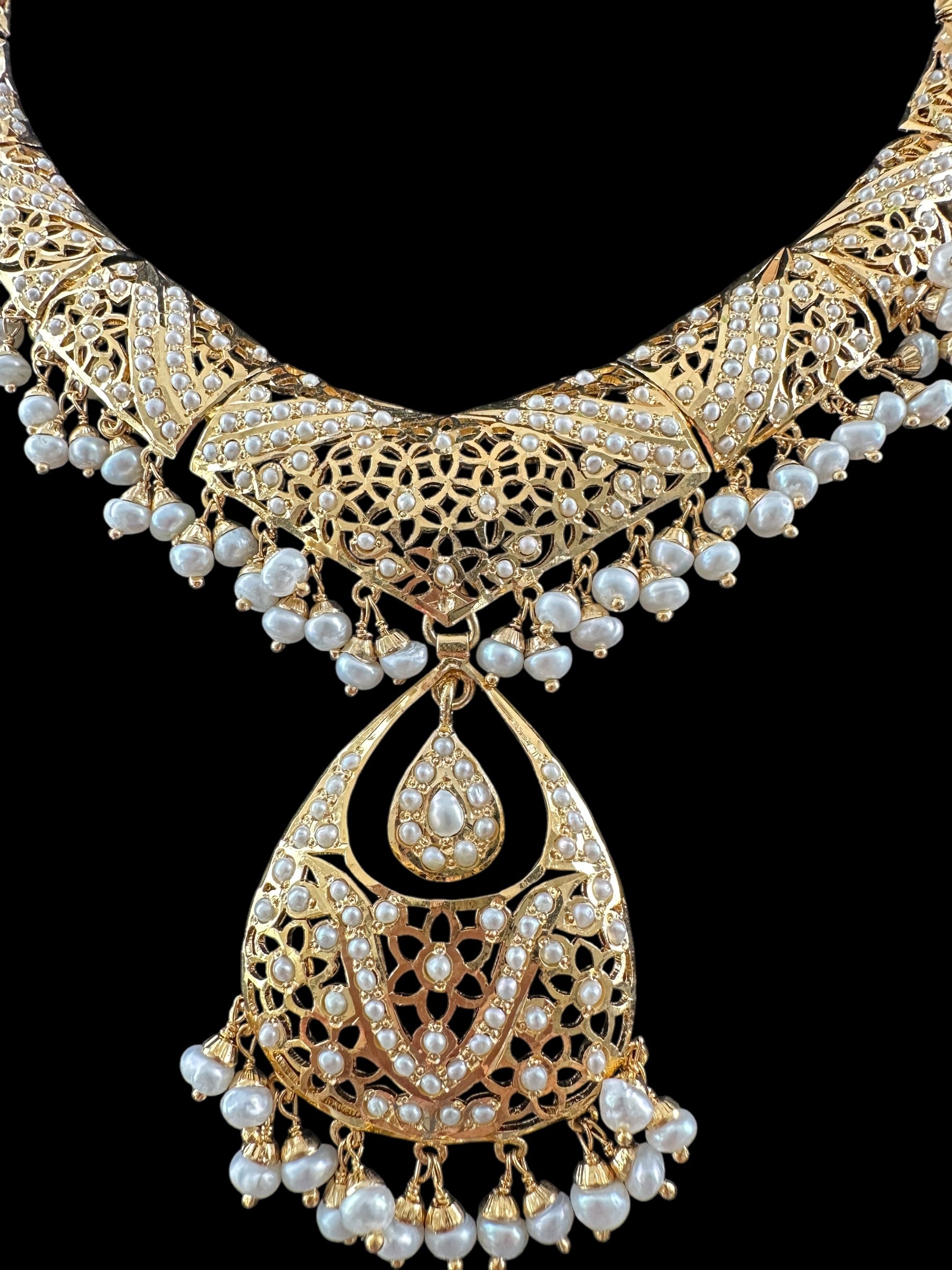 Pearl necklace matched with a pair of chandbali earrings, made in 92.5 gold plated silver. The setting stones are a precious fresh water pearls . All pearls used in this set are precious freshwater pearls.
