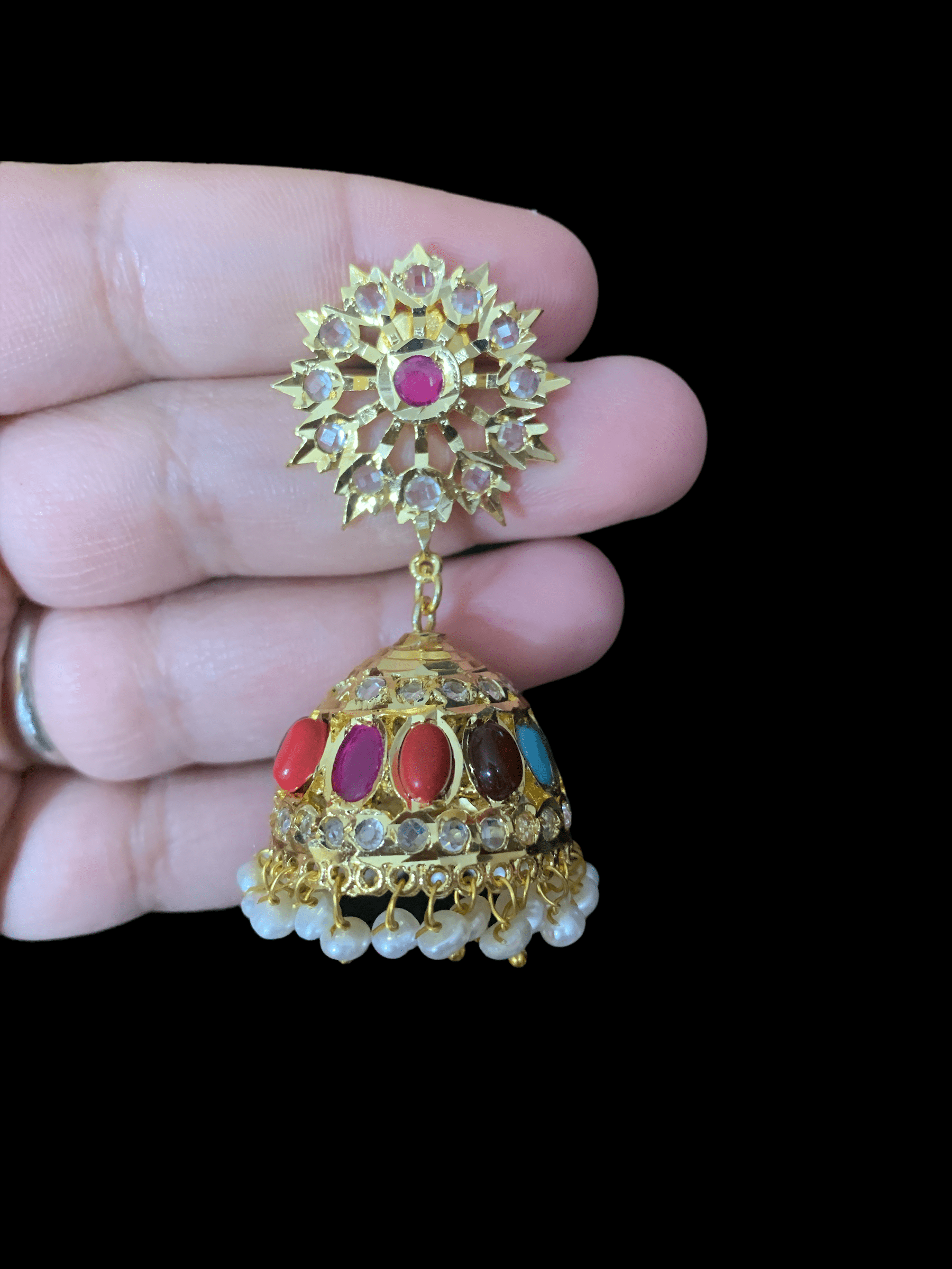 Hyderabadi fresh water pearl jhumka -navratan ( READY TO SHIP )