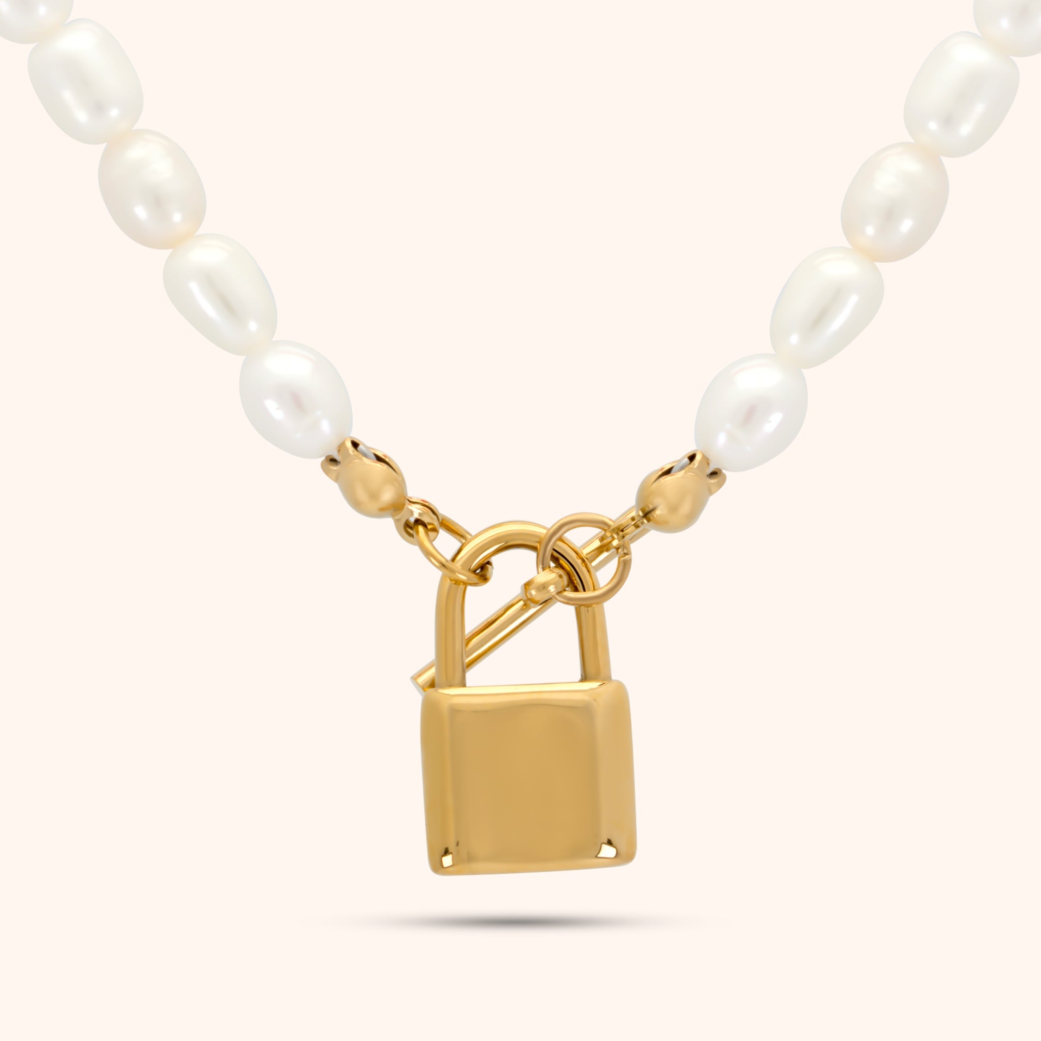 What we hold onto says a lot about who we are. The Keep Necklace blends classic pearls with a bold gold lock — equal parts softness and strength.
