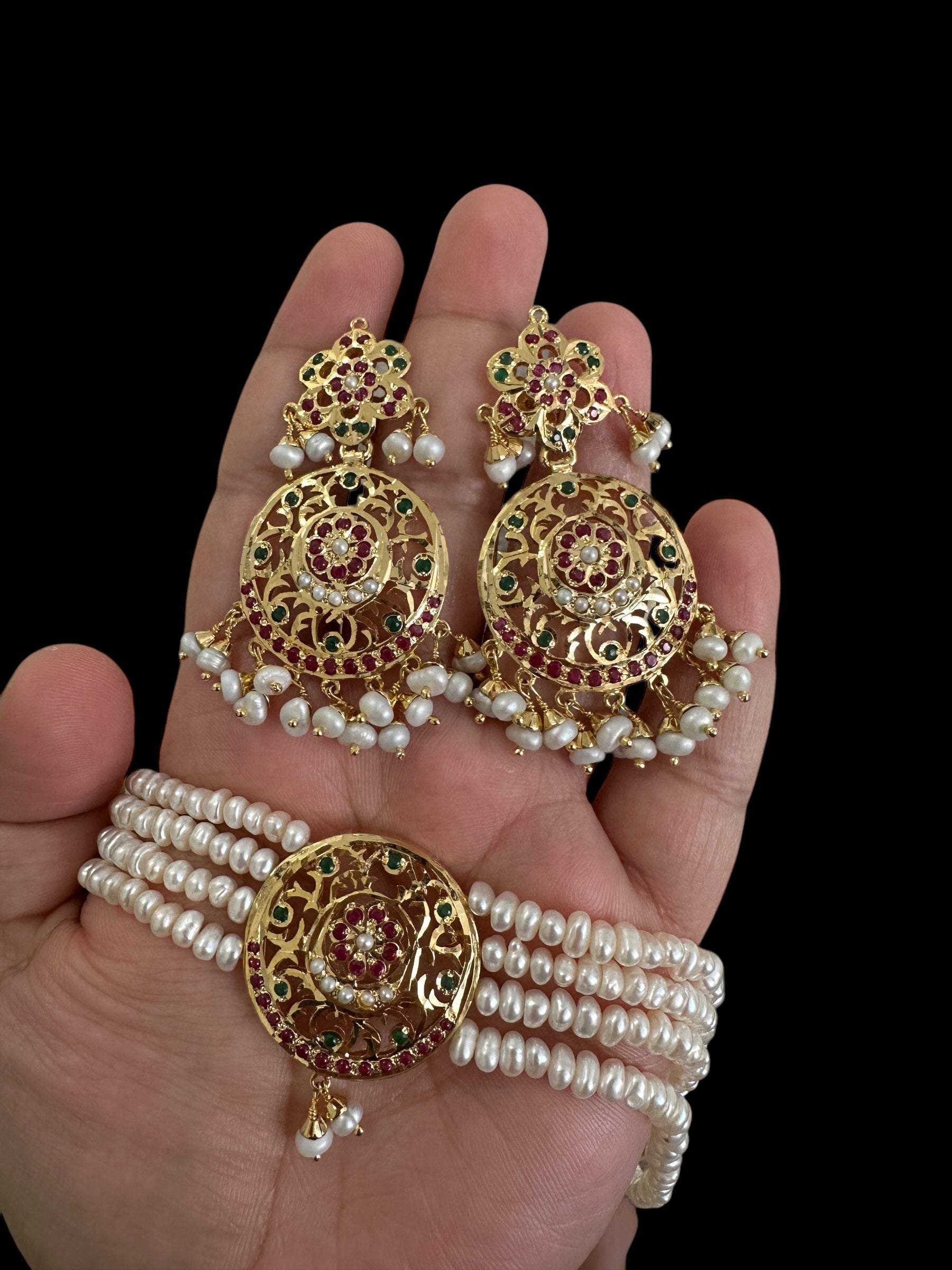 A light and elegant choker set set with precious freshwater pearls and red & green stones that resemble rubies and emeralds. The stringing comprises freshwater pearls weighing 50.73 grams
