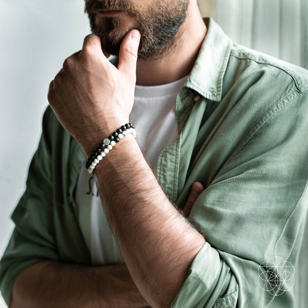 On this unisex bracelet, the grounding and centering Shungite is combined with the gentle and calming Howlite. Howlite is regarded as a symbol of relaxation and is said to enhance the flow of energy within, fostering a sense of stable and uplifting vibrations. It serves as a reminder to embrace relaxation and tranquility as your default state of being.